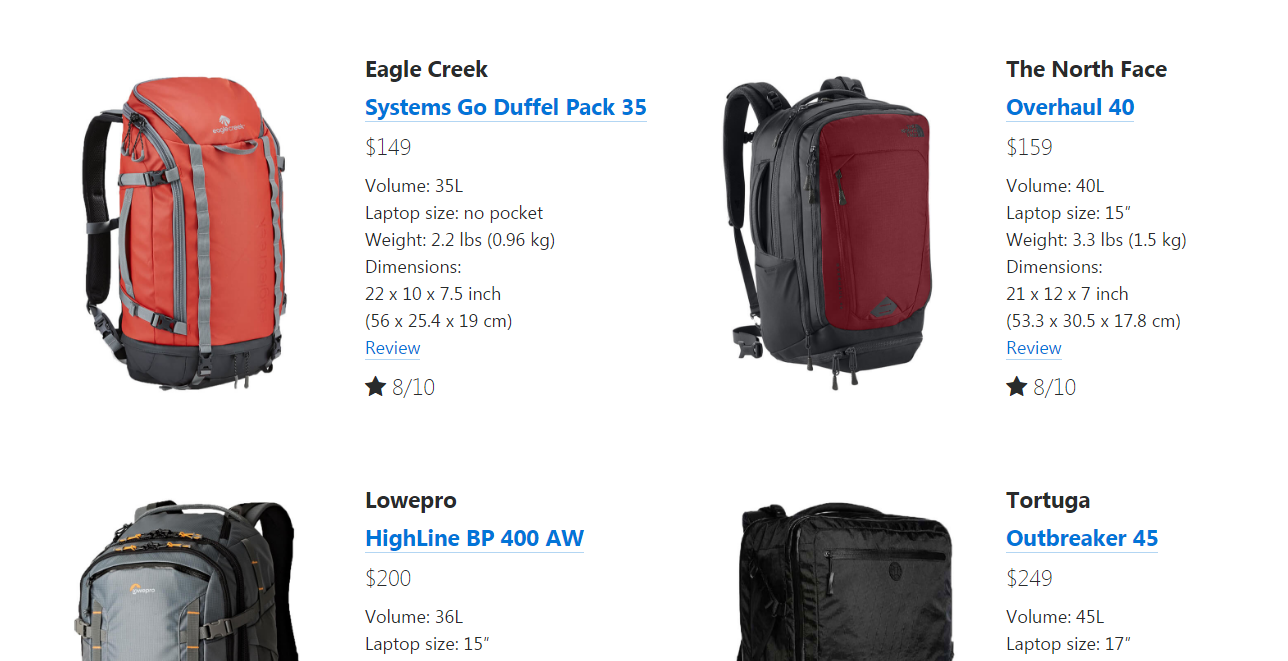 I came with a pretty simple formula to calculate the rating. From my experience, the most important things are price (1-3 points), dimensions (1-3 points), weight (1-3 points) and a pocket for a laptop (0-1 points). I also made filters like Best, Cheap and Lightweight to collect backpacks in groups.