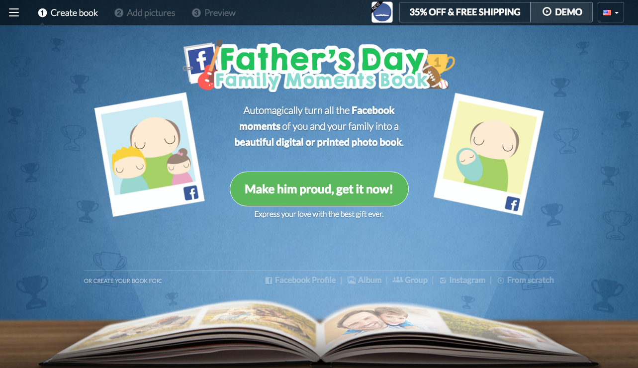 After our Mother's Day Photo Book (https://www.producthunt.com/tech...) now it's the time for Dads: if yours is on Facebook, this can be a beautiful gift for him - a nice book with all the pictures of you together, created in one click! ;)