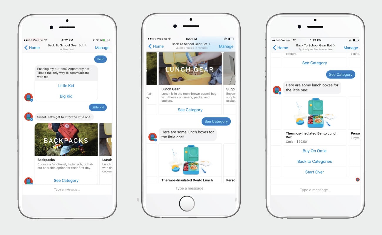 It's a Facebook Messenger-based virtual assistant that can help you find backpacks, school supplies, gadgets, lunch boxes and shoes for kids in preschool through elementary school, broken out by Big Kids v. Little Kids.