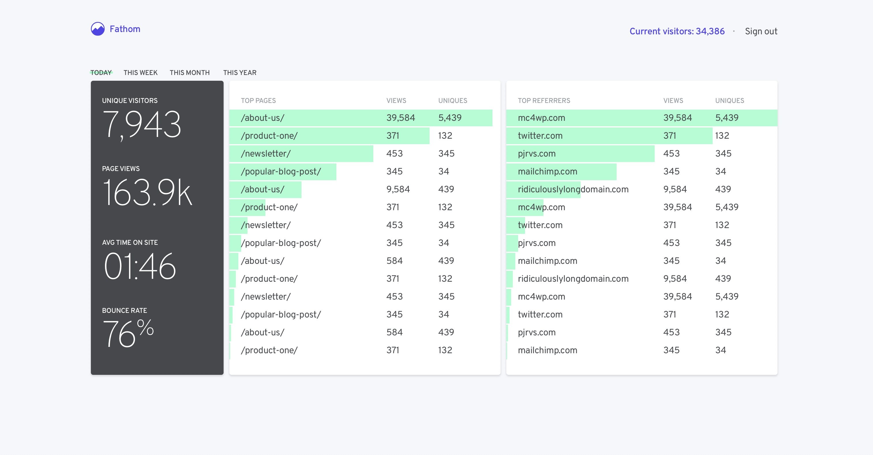I'm not an analytics guru. I don't love logging into Google Analytics. I'm a content creator who wants to see how many people visit my site, what pages they visit, and where people are coming from. I've been using GoSquared for years and appreciate how they put the most important analytics front and center (and hide all the confusing and not important stuff). But, paying $99/mo for GoSquared is too much for what I need. Really excited to have Fathom to replace GoSquared and keep me from having to login to Google Analytics!