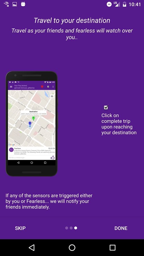 Fearless lets you reach out to your friends and have them watch over you as you travel. Select the destination and contacts, who will see a live map of your progress and get updates about your trip. Fearless will check your speed, location, headphone’s connection and inactivity. Your friends can react to the trip updates, accordingly. With Fearless, wherever you go, get there safely and fearlessly.