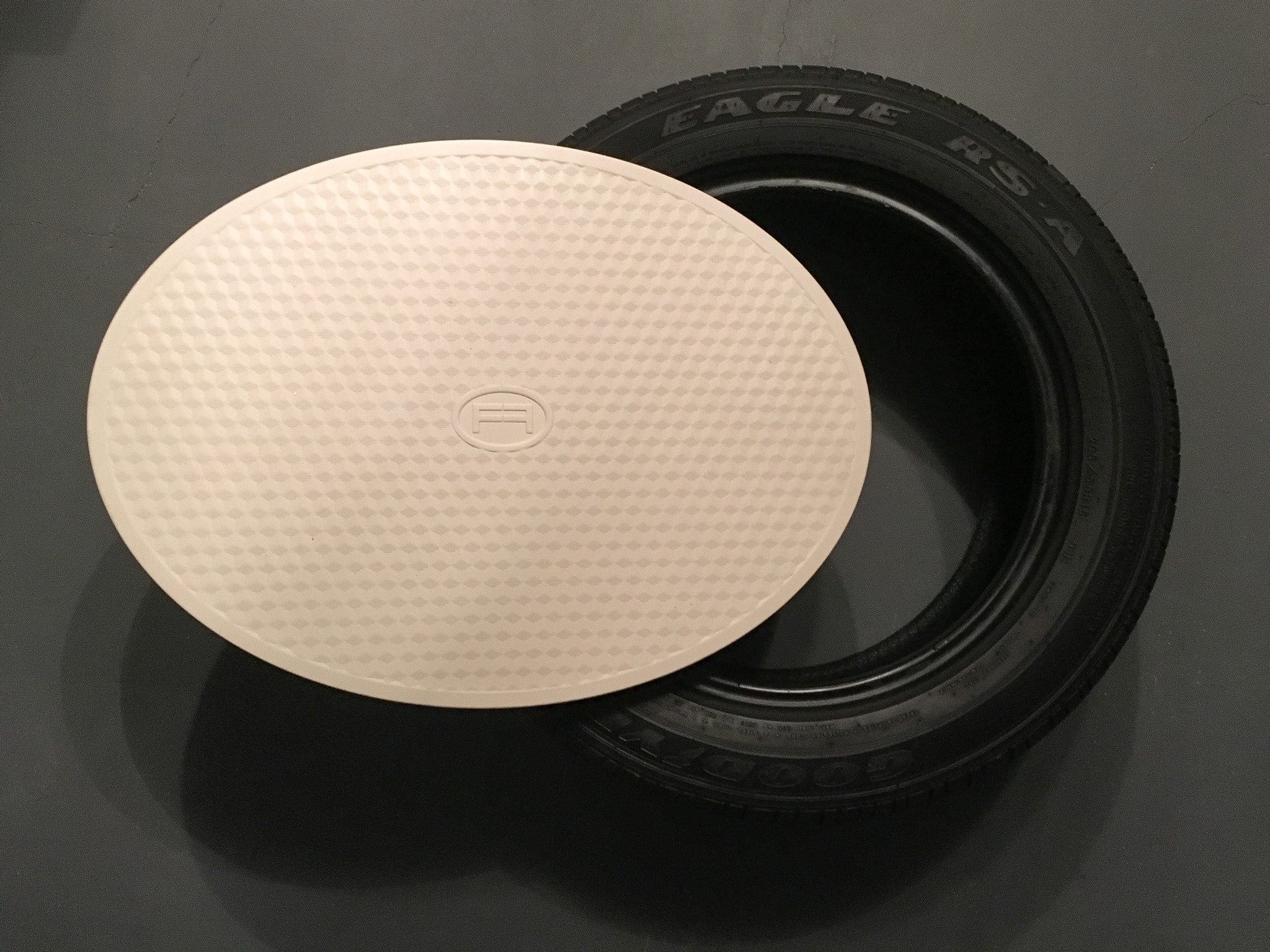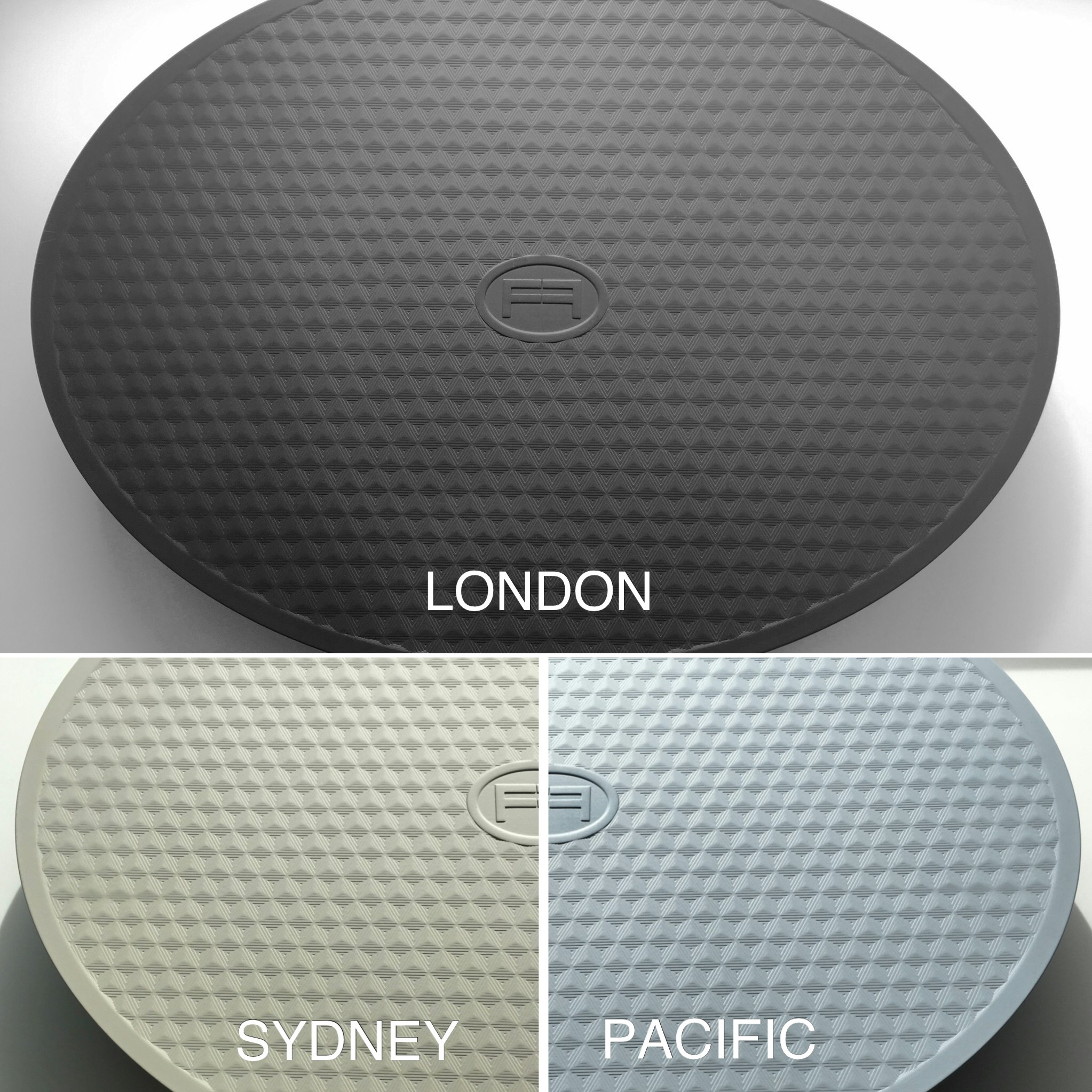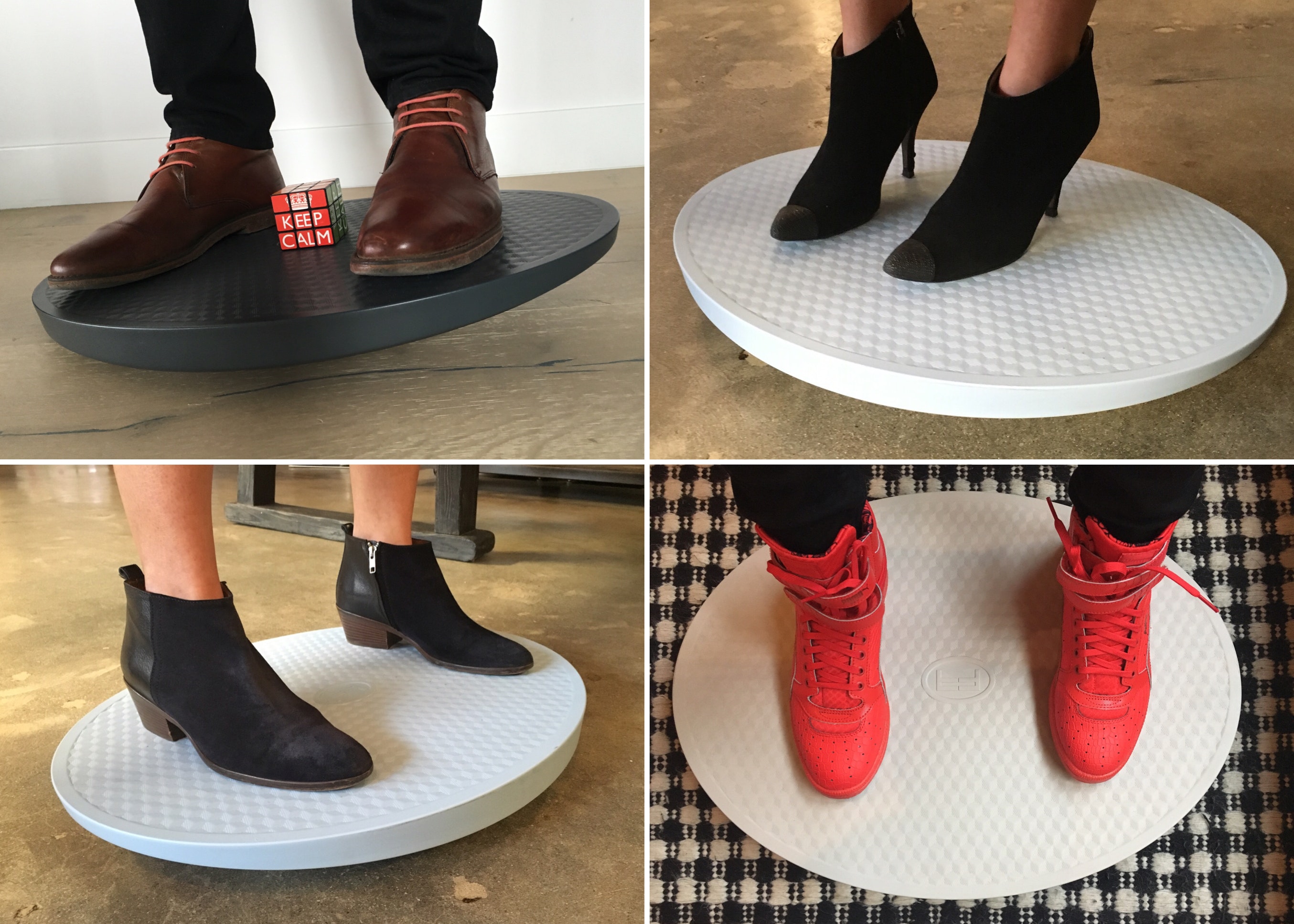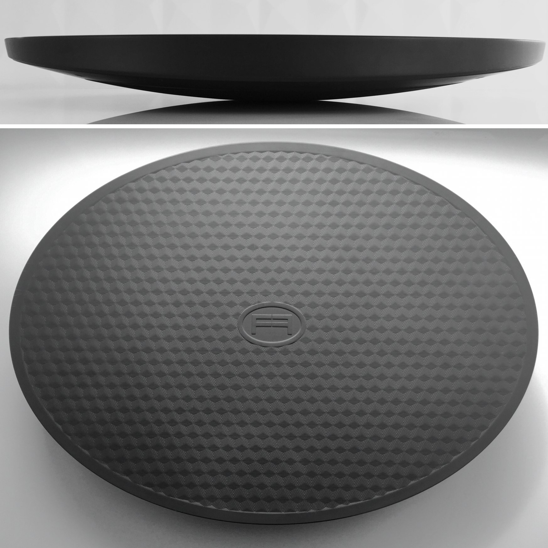 The top platform is made from easy to clean ABS plastic and covered in a slip-resistant surface.. A real breakthrough came when we began using compressible rubber for the center and base allowing for a natural cushioning which significantly enhances comfort and stability. This rubber is sourced from 100% recycled tire rubber making it extremely durable yet absorbent increasing service life of each FEAZER and making it safe to use on all surfaces.