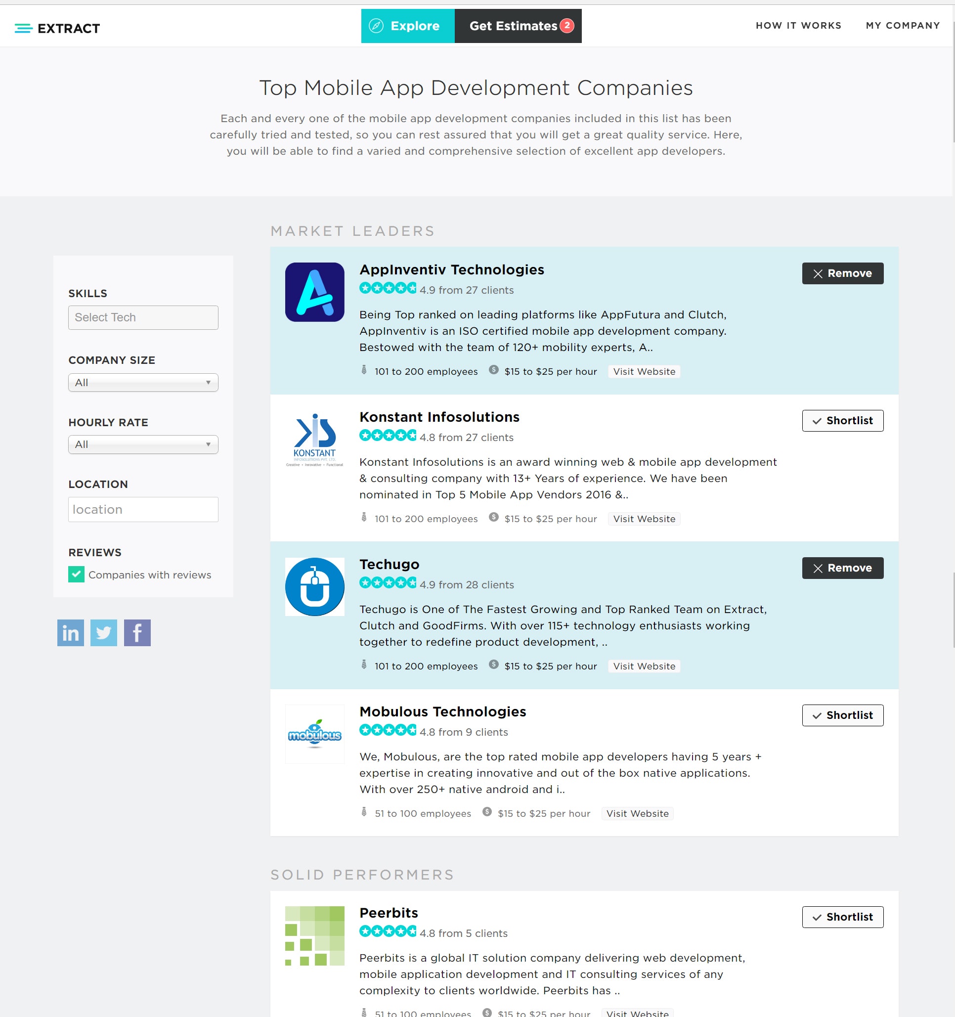 https://extract.co solves two main problems in the software industry. If you are a entrepreneur with an idea and you don’t have enough information to choose the right software company to work with. Extract rank companies based on previous customer stories and, help users to research through the data free of cost.