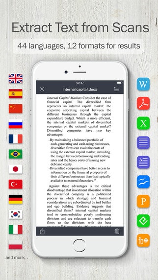 Scan any printed or hand-written papers and books create perfect digital copies & save them to JPEG or PDF documents. Recognizes text from scans in 144 languages and saves results in 12 formats (DOCX,PDF,TXT & more) preserving the original document formatting.