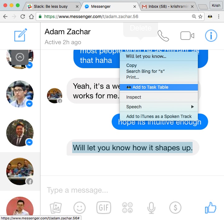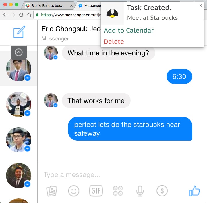 Hi guys, we created www.fireflies.ai to help manage our daily communication channels. Right now Fireflies is a Chrome extension (mobile coming soon) that automatically creates follow up tasks as you converse across FB, Slack, Email, and every other communication channel.