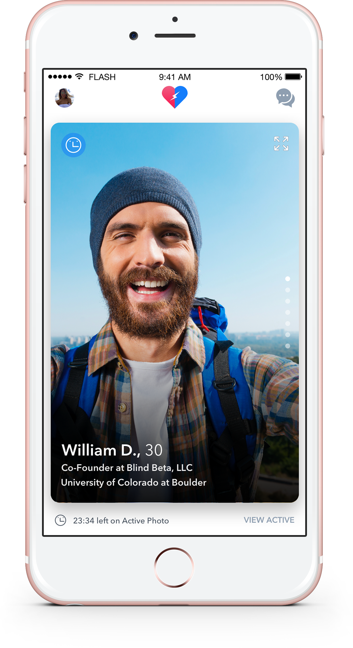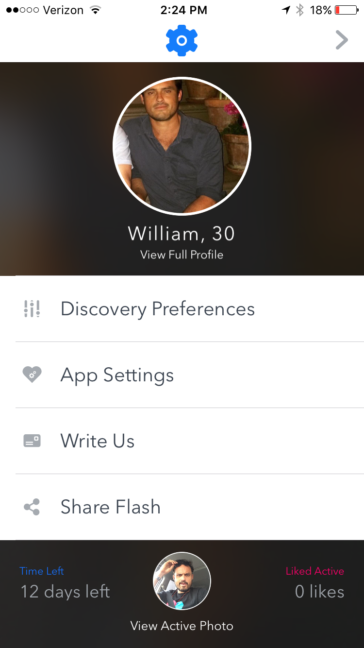 The problem with online dating is not knowing if the person you're meeting actually looks like their profile photo. On Flash, a user must take a photo of themselves, called their Active Photo. Each Active Photo lasts for two weeks, or until yo… See more