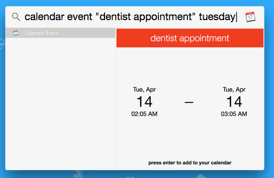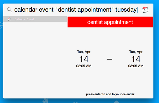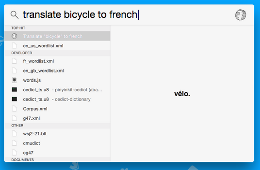 One day I wanted to write a plugin to let me search for weather forecasts in Spotlight — but I discovered Spotlight didn't have an API. So I made one, by injecting code into the Spotlight process. It's not perfect (and certainly not as good as Alfred at this point) — but I think it's a big plus to be integrated into existing Spotlight results.