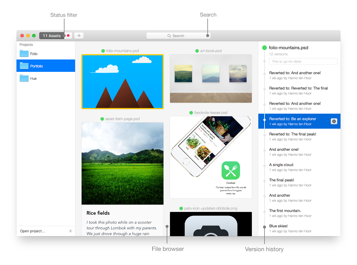 We’re really happy to unveil Folio for Mac today. It’s helped us and our testers remove the clutter from our design folders (no more endless lists of duplicates) and explore new design directions with the confidence you can always go back.