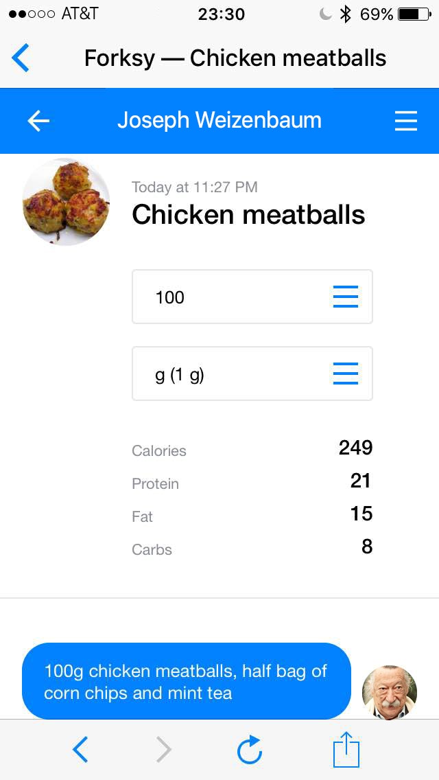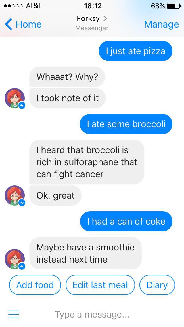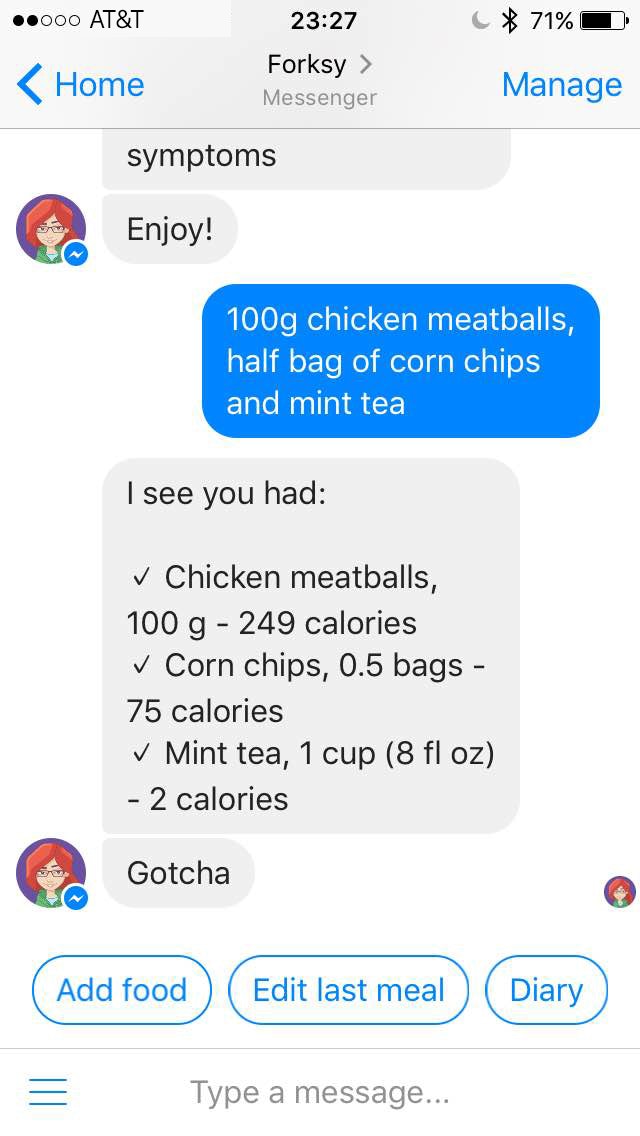 Check out the newly launched product from my friends – calorie tracking bot for major messaging platforms. I think it's a pretty interesting use case for bots, since friction of opening an app is something that stops a lot of people from filling in data about their diet.