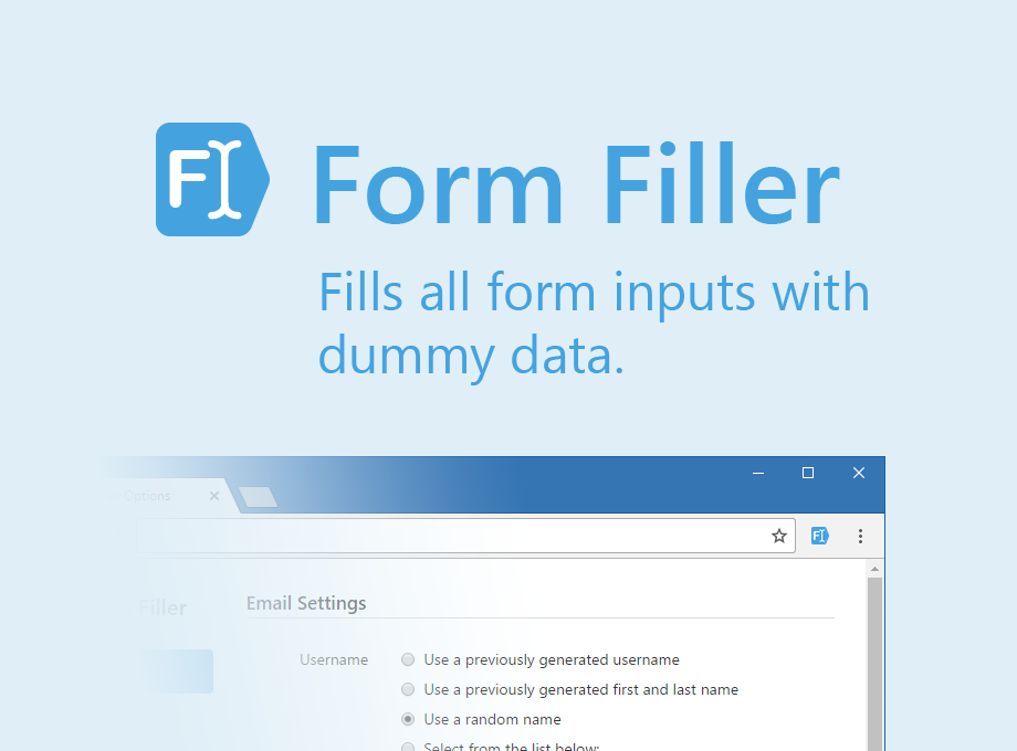 The Form Filler extension allows you to fill all form inputs (textboxes, textareas, radio buttons, dropdowns, etc.) on a page with random/dummy data. The purpose of this extension is to help developers test their forms quickly and easily by eliminating the need to manually type text in input boxes, select dropdown values, and so on. It is smart enough to kno… See more