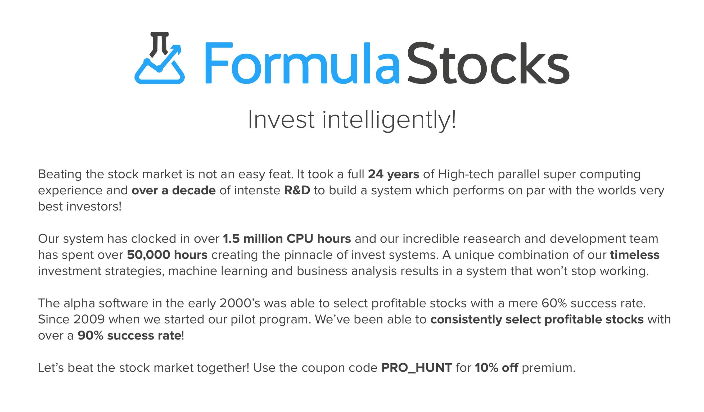 Hi everyone, I’m the co-founder of Formula Stocks! We’ve been working hard for the past 14 years on this product. We’ve rigorously testing it for over 7 years in real time market environments, and now we’re finally ready to go public.