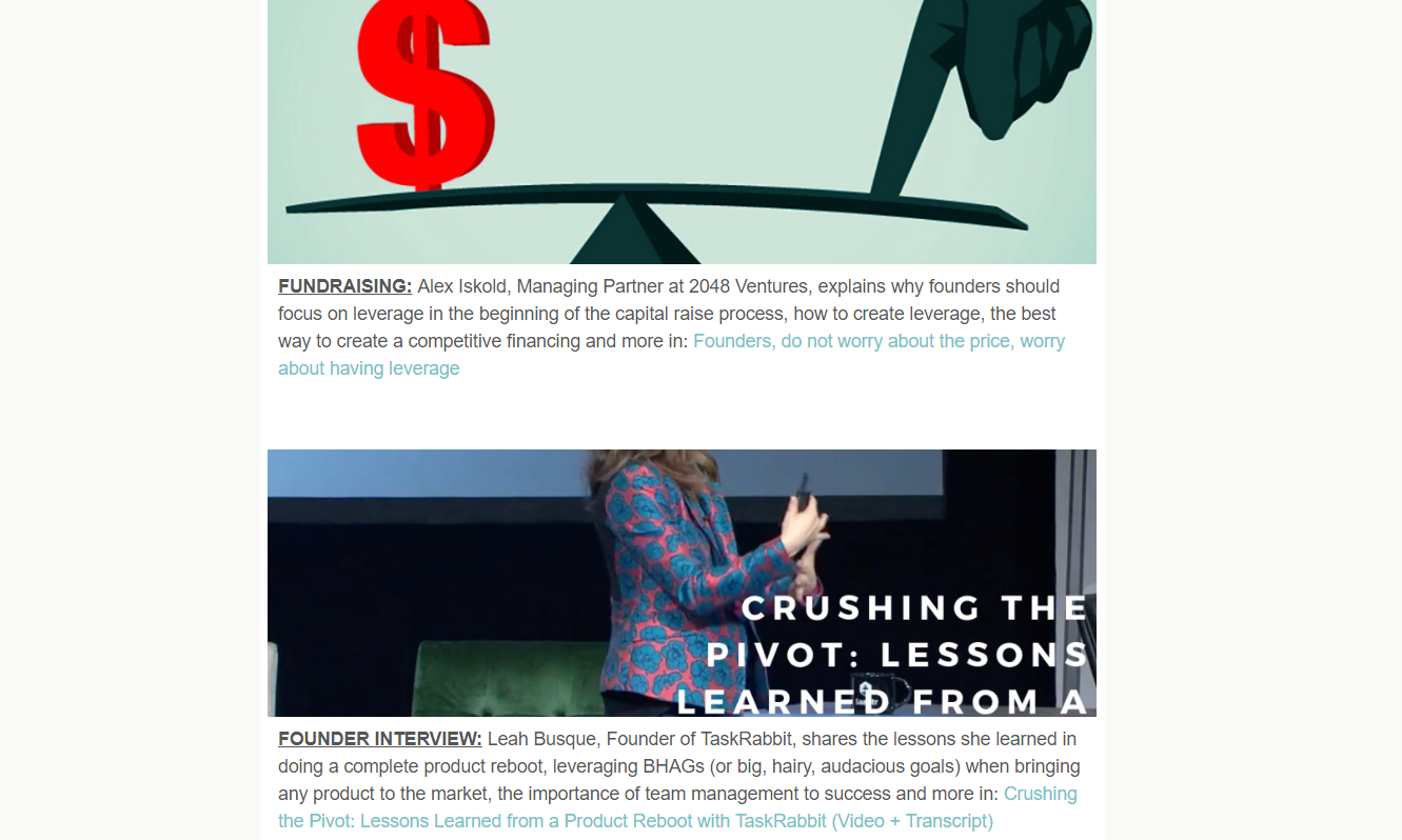 Some of my personal favorite sources of content have been First Round Review, Y combinator, Elad Gil, Ben Horowitz, and the 20minVC