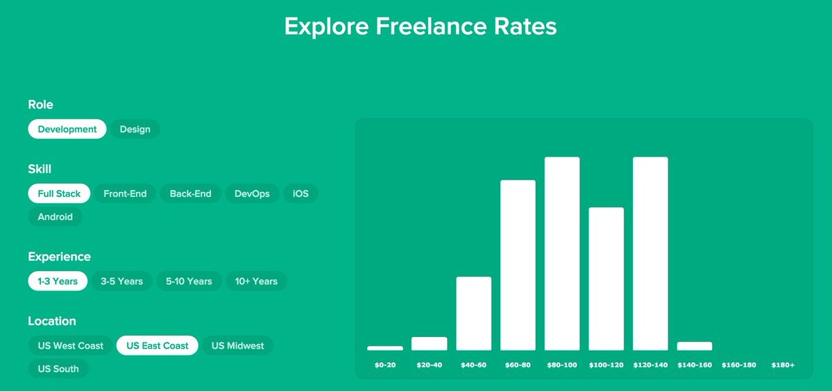 @matttbrown Super helpful to see as college student/ budding freelancer! Might be cool to have an option to highlight (different color) the average column of each graph. Or possibly for each skill set have an overview graph that shows the average hourly for each of the year break downs (1-3yr, 3-5yr...)