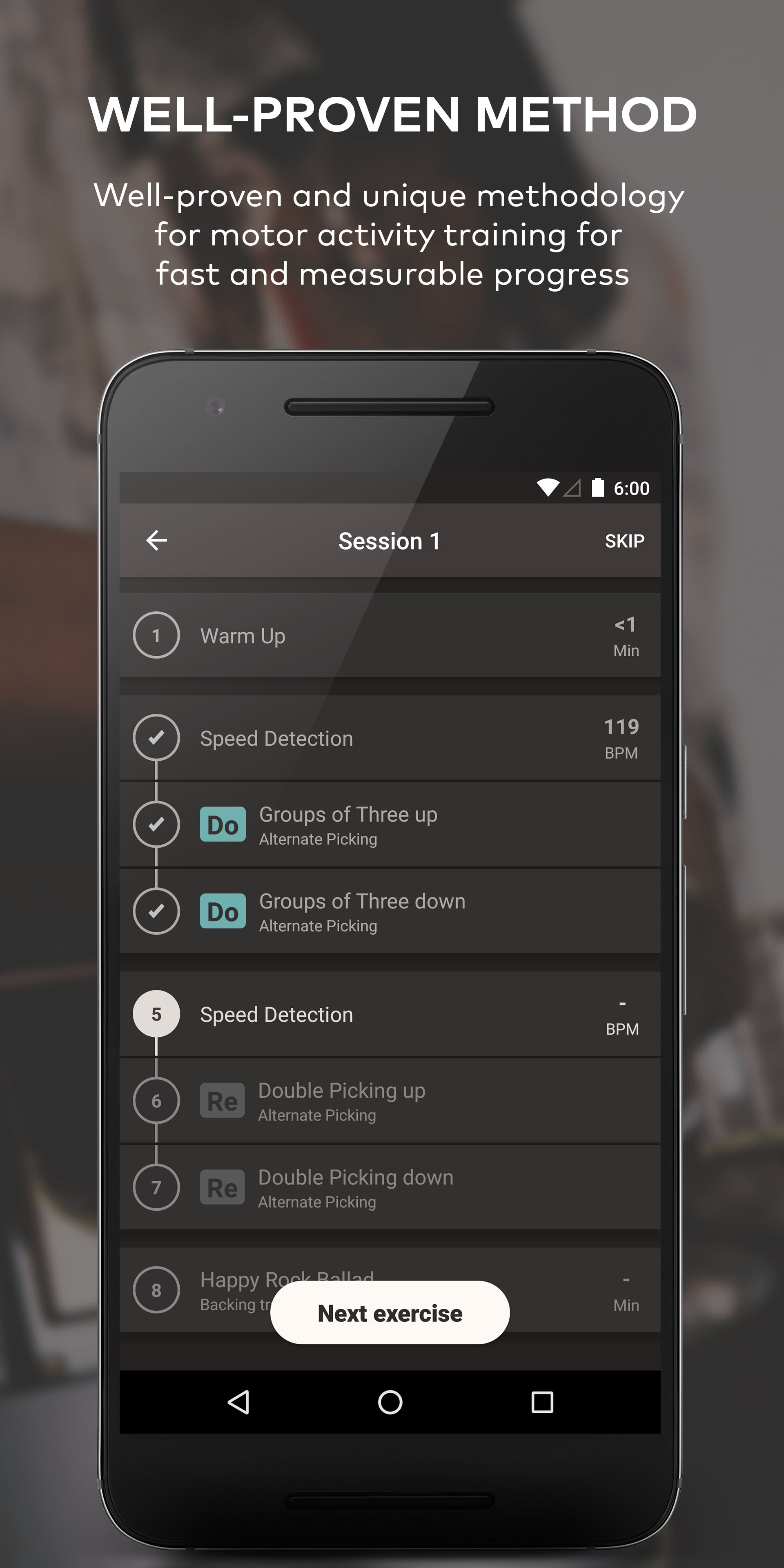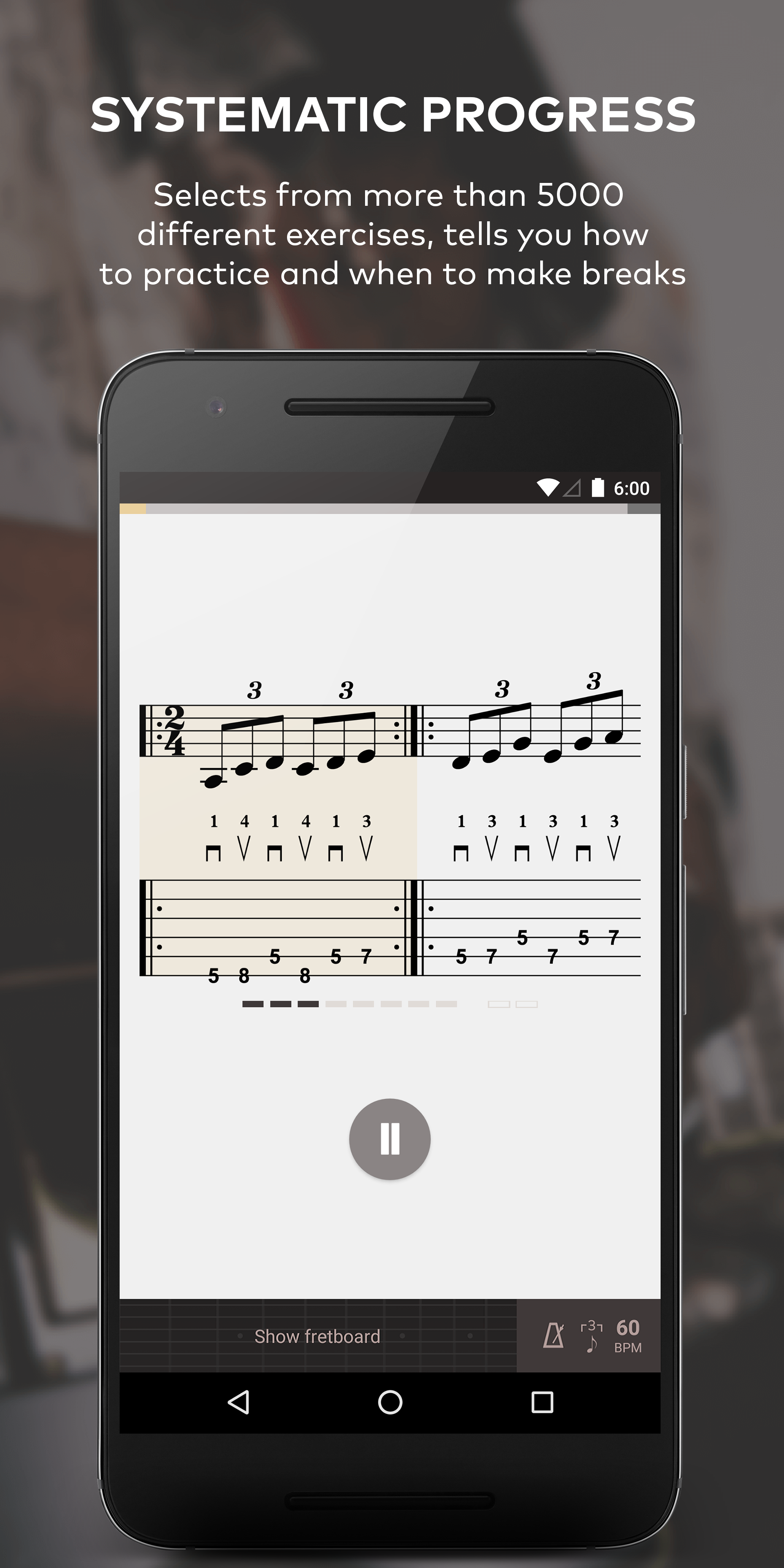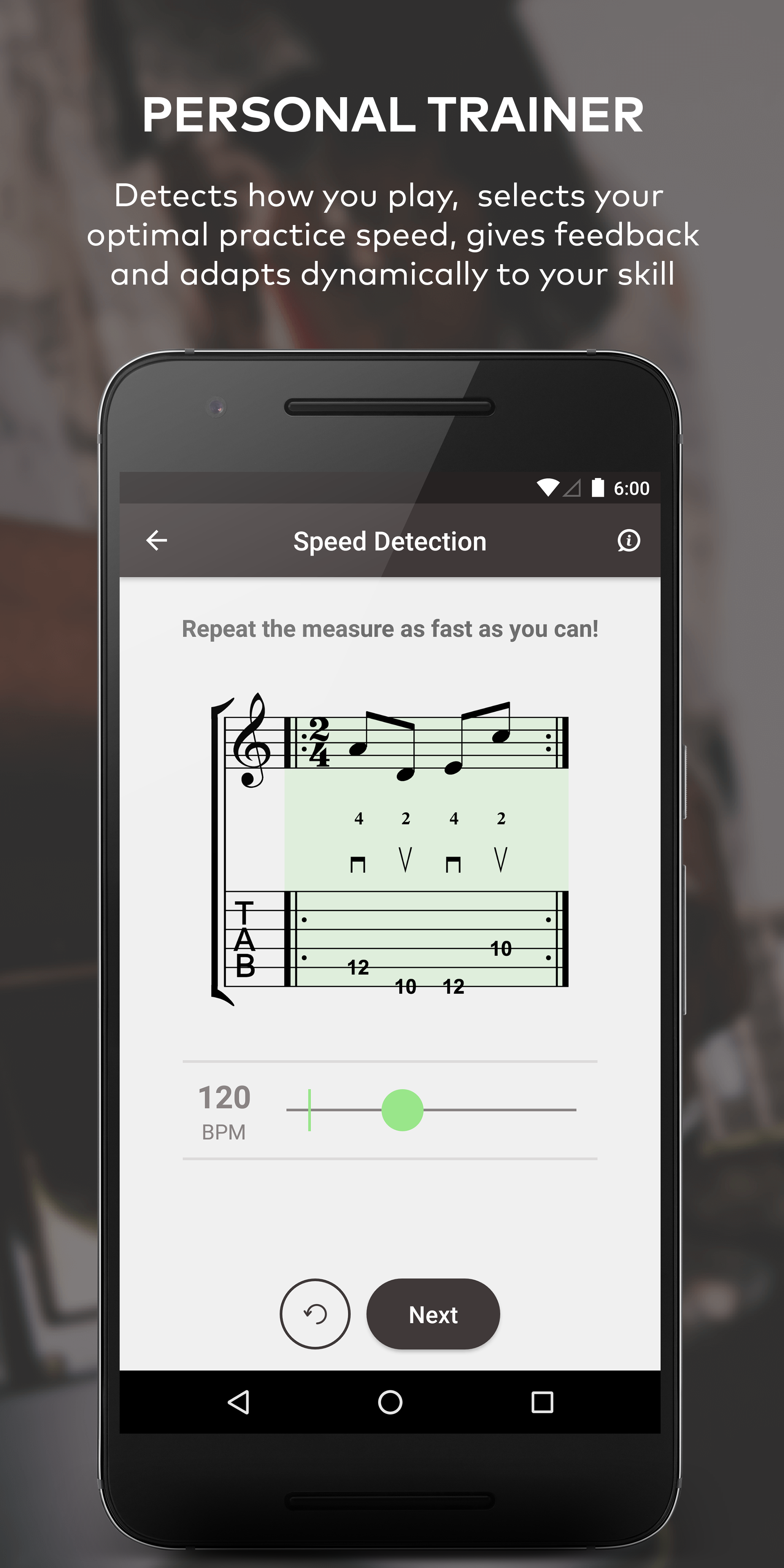 Fretello helps you learn guitar faster, more effectively, and permanently. It creates individual exercise regimens that are tailored to your specific needs, detects how you play, selects your optimal practicing tempo and adapts dynamically to your progress.