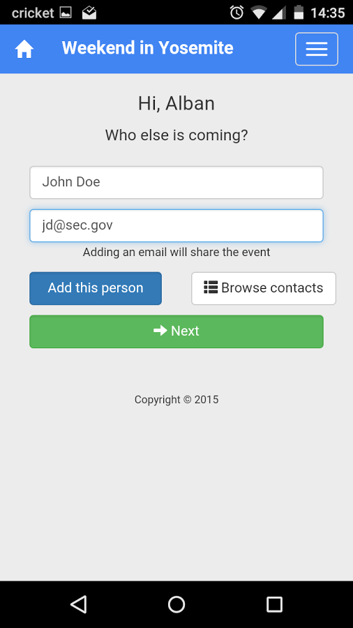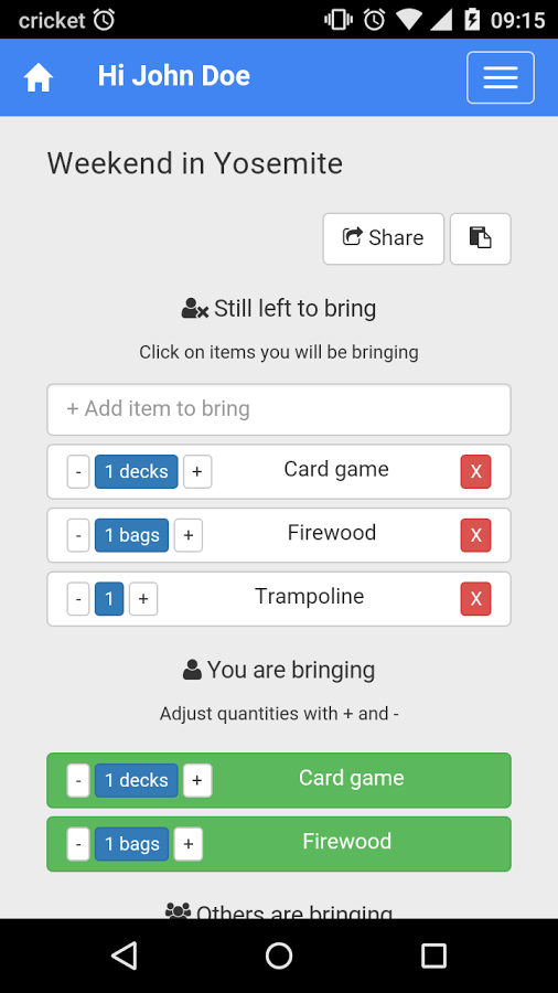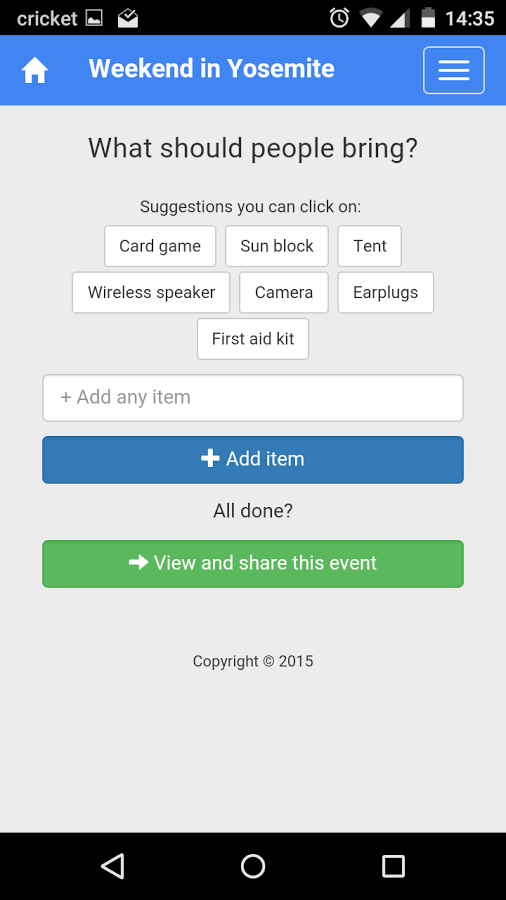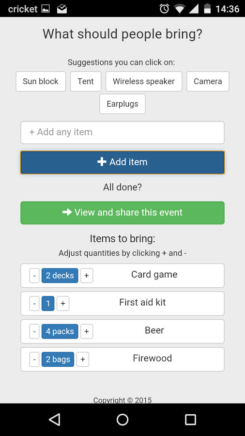 Friendsvite is a way to know "who brings what" at an event without the hassle of login in or anything like that. Just create an event and share the code or the link on your facebook event/doodle, and people will be able to pick what they need to bring.