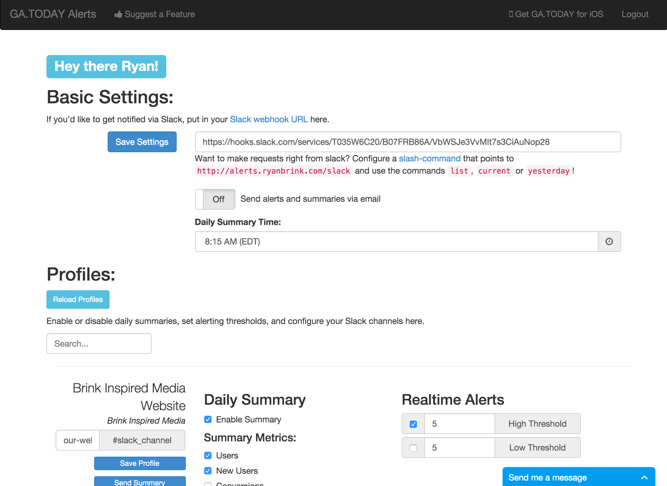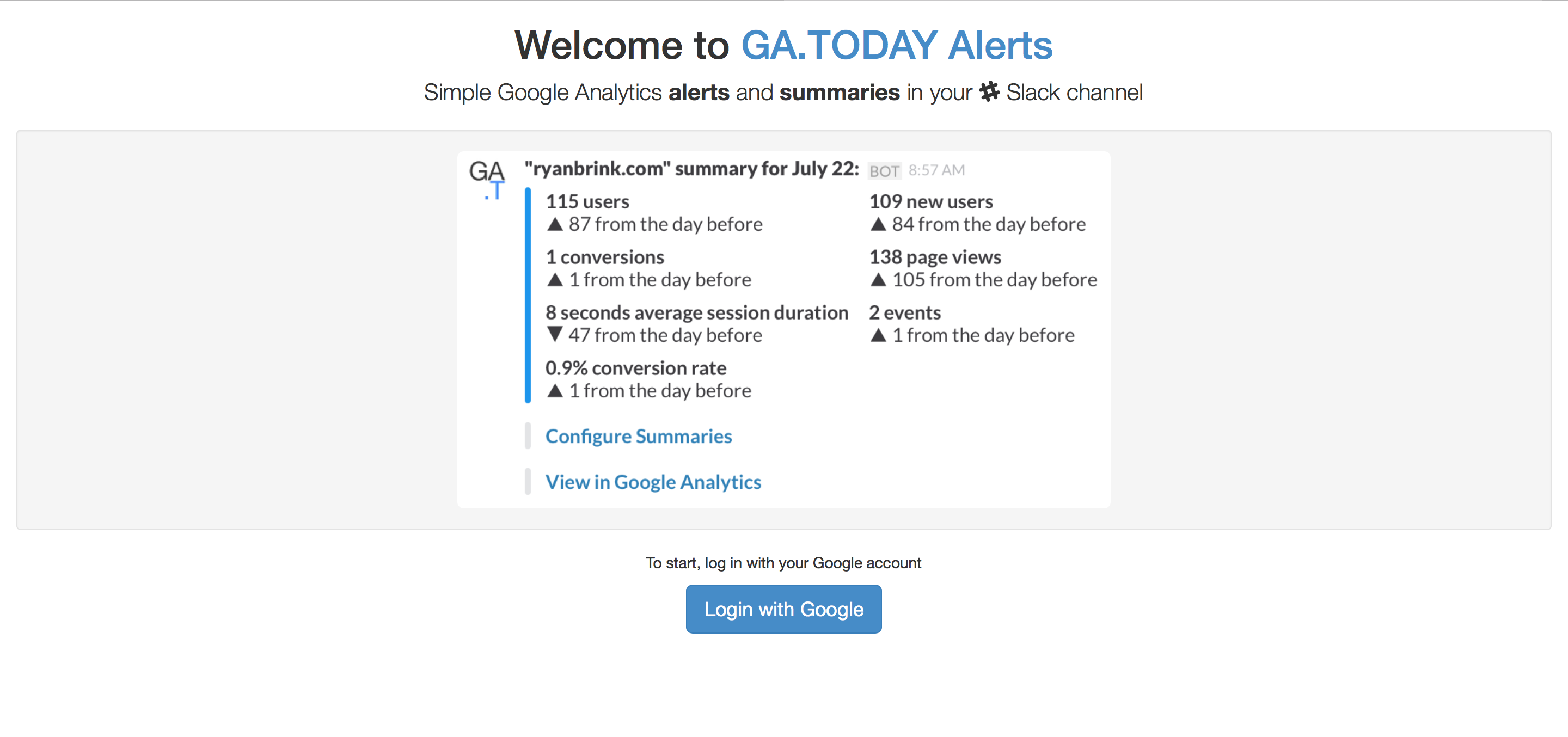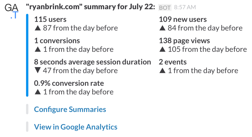 Thanks for hunting @raynesio! I decided to build this simple integration because there are no two tools I use more often. Alerts are extremely useful because I like to know when there is a spike in web traffic (so I can figure out where it's coming from and get involved if needed), and summaries help me stay on top of overall trends.