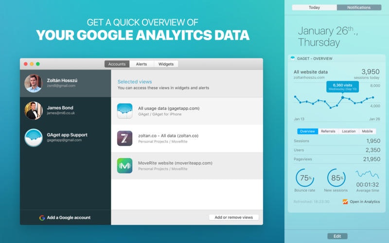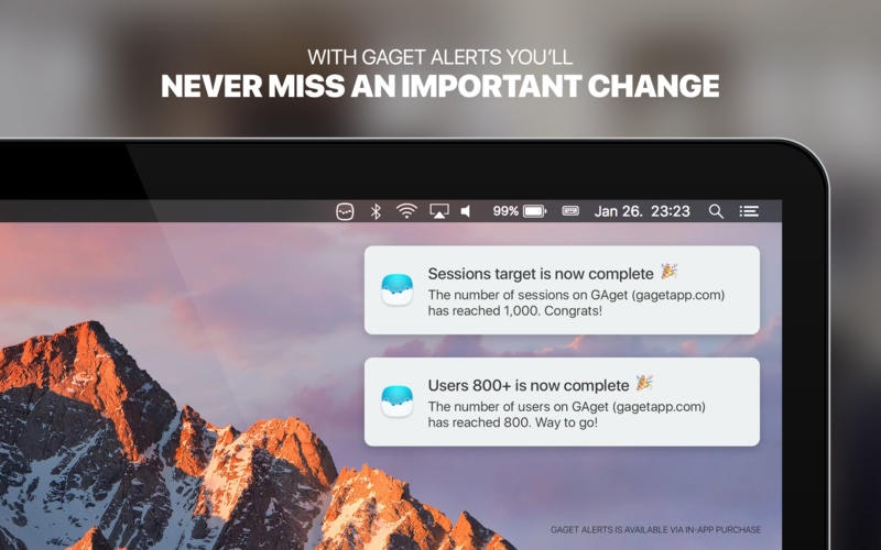 - An awesome new tool called GAget Alerts. It’s a menubar app that monitors your Analytics traffic and notifies you about significant changes.… See more