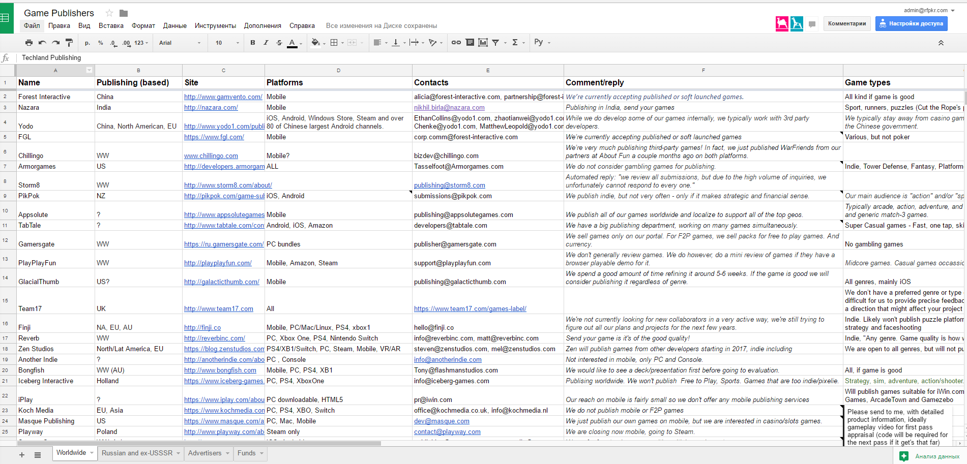 During my work, I found a need to find a complete list of the game publishers. I found some outdated bits of information, and it wasn't satisfying. So I began to work on my own list, where I have aggregated information that I have collected from the search and my own contacts.