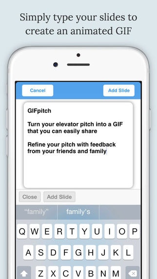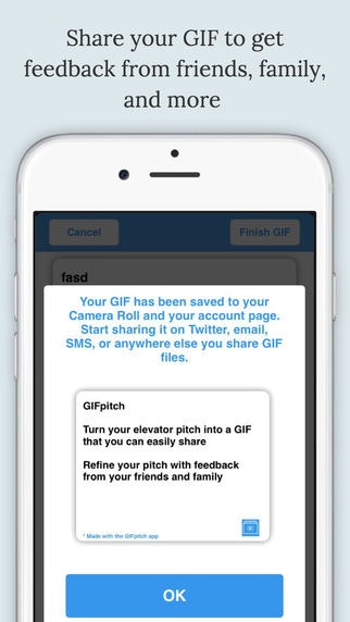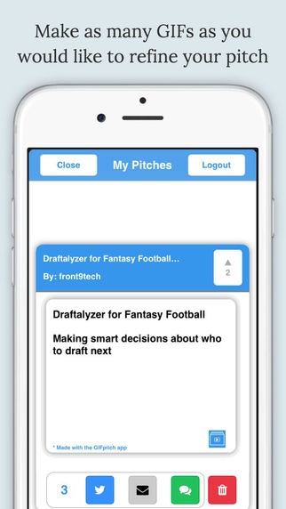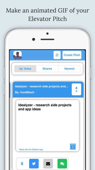 GIFpitch walks you through a few screens of entering text to make an animated GIF with your elevator pitch that you can share on Twitter, email, text, and more.