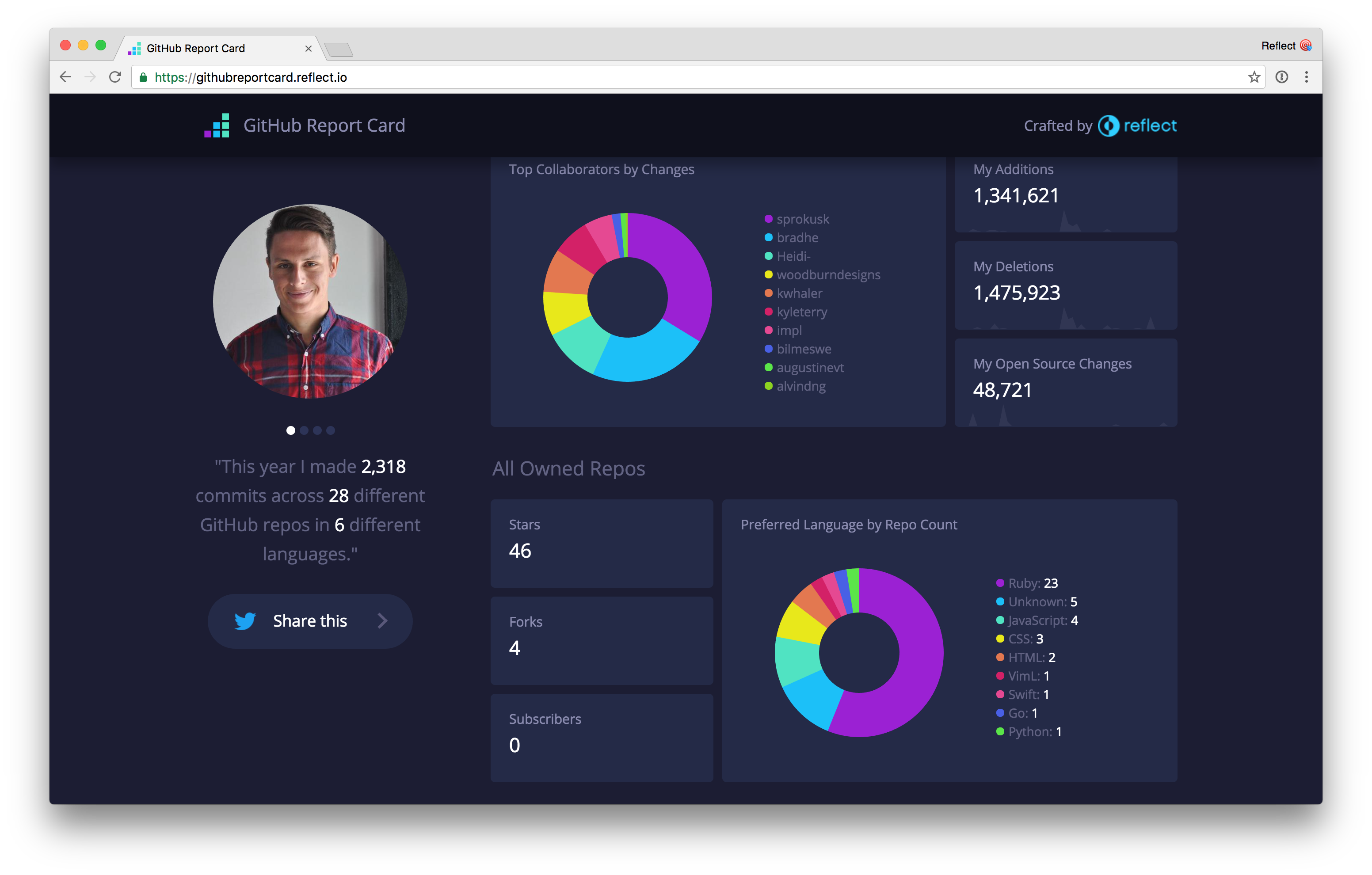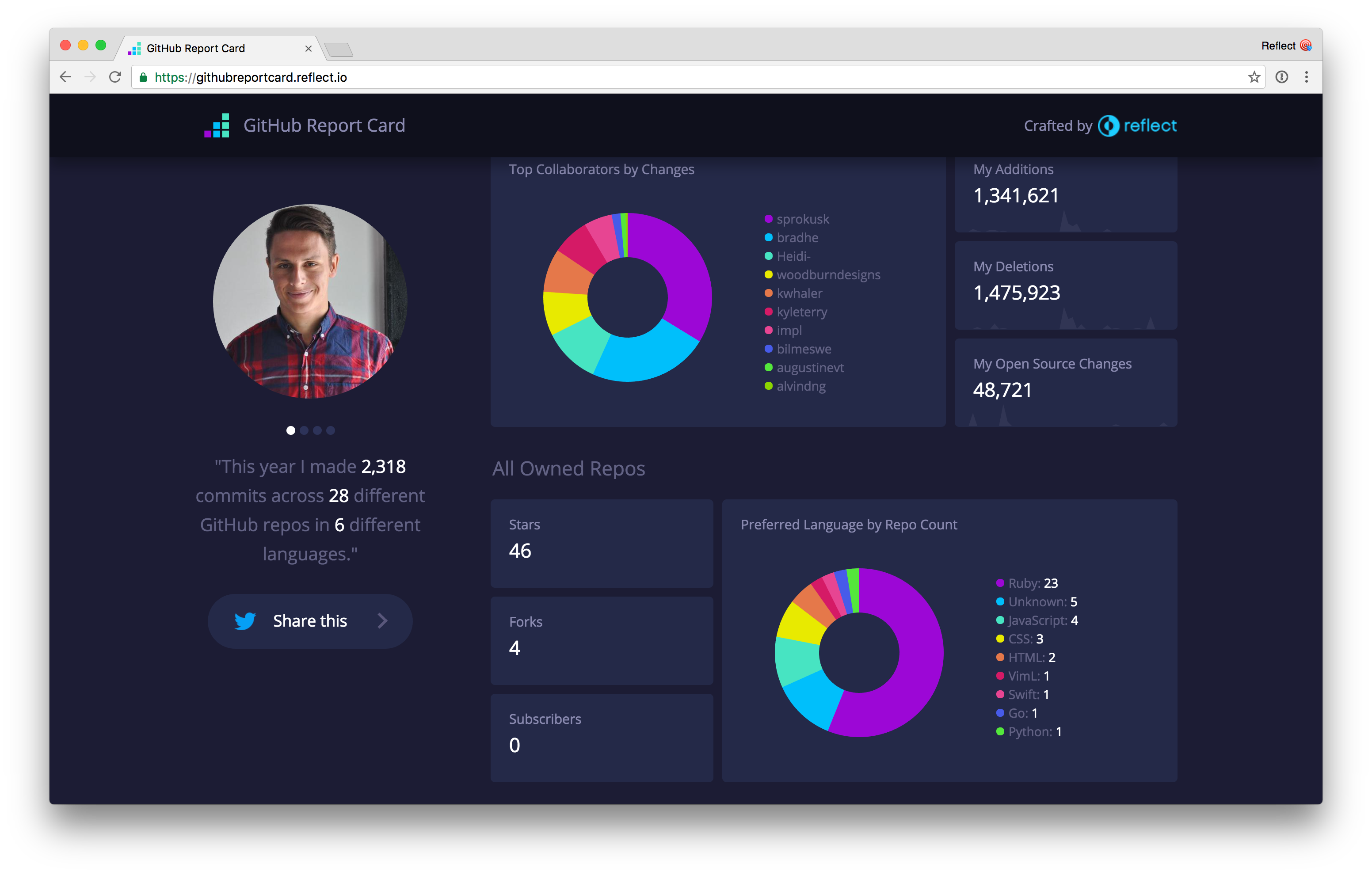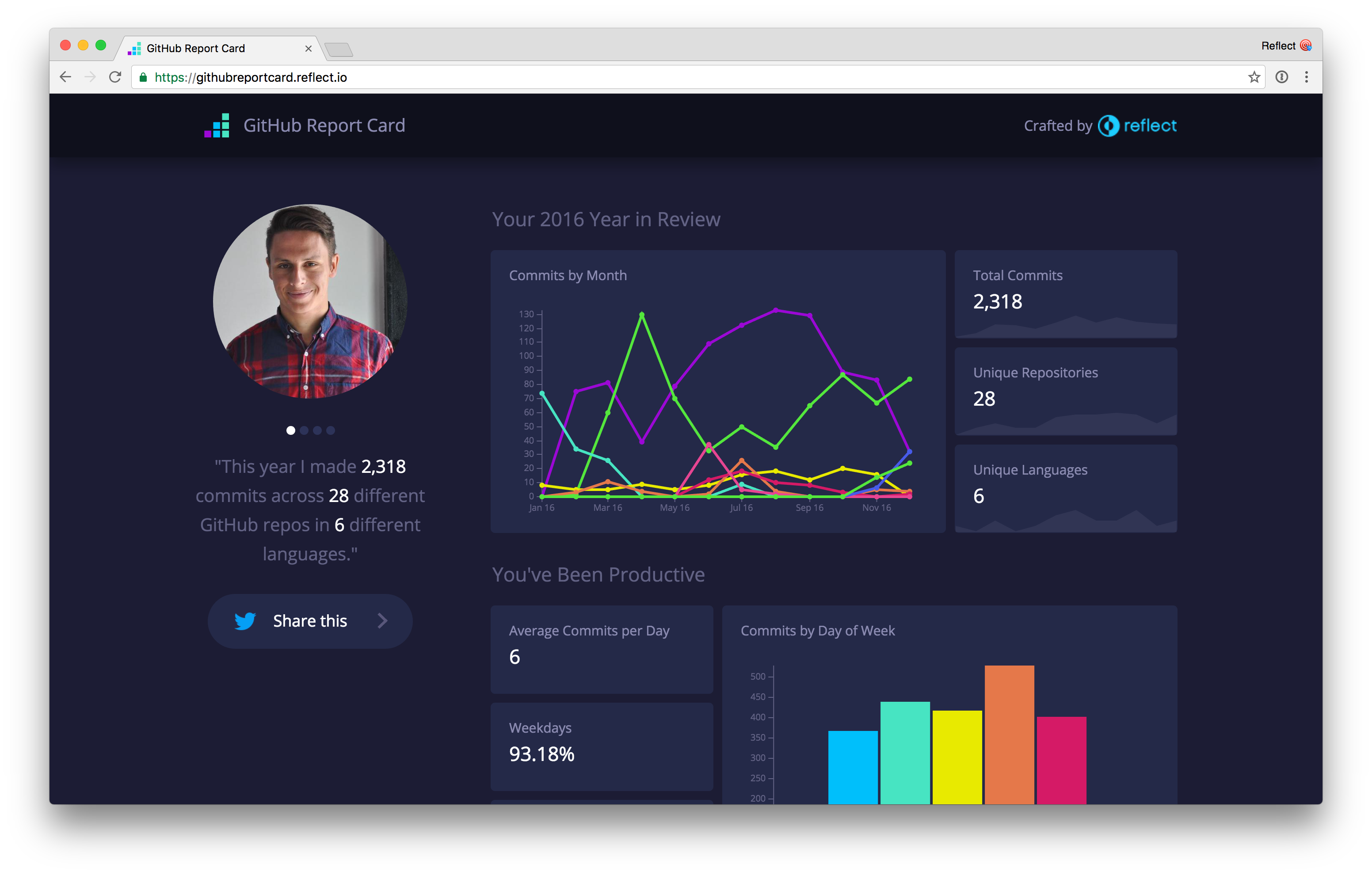 I'm a sucker for year-in-review visualizations and the folks over at https://reflect.io just dropped this rad dashboard for your GitHub account