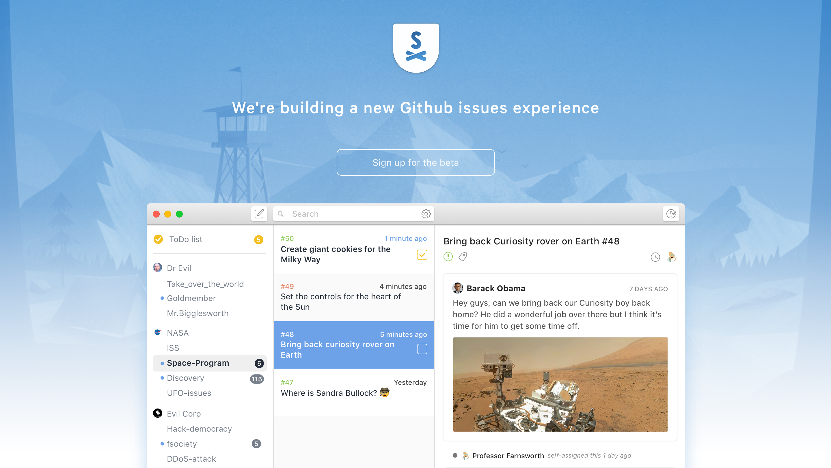 We love Github but we all work on projects splitted in various repositories (and sometimes various organizations, I'm looking at you freelancers!) and constantly switching from one to the other to follow up on a bug or a task is pretty annoying.