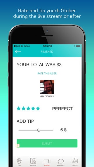 Glober is a unique on-demand service that enables users all over the world to request, create and watch live streams and pay each other simultaneously. Viewers can request live streams of any point of interest and have more control over the interactive stream. Content creators are able to monetize their location and knowledge, get paid for the h… See more