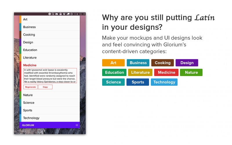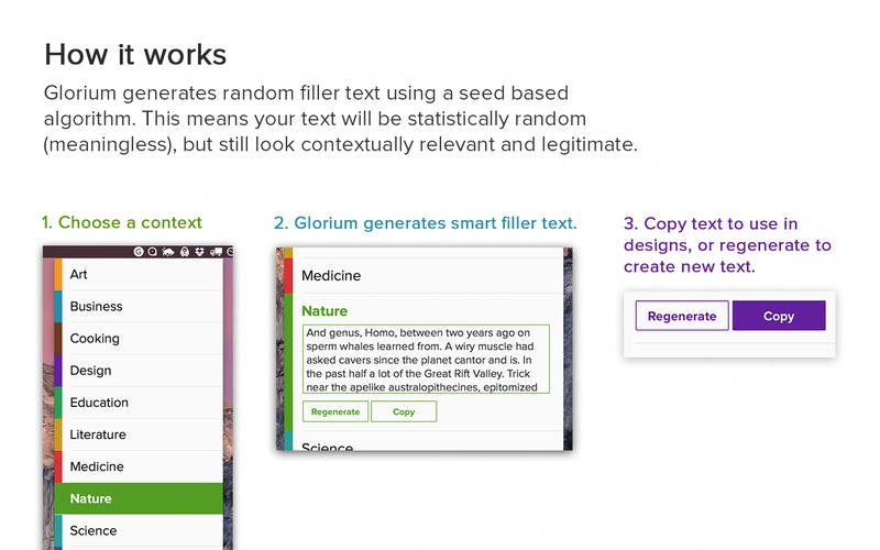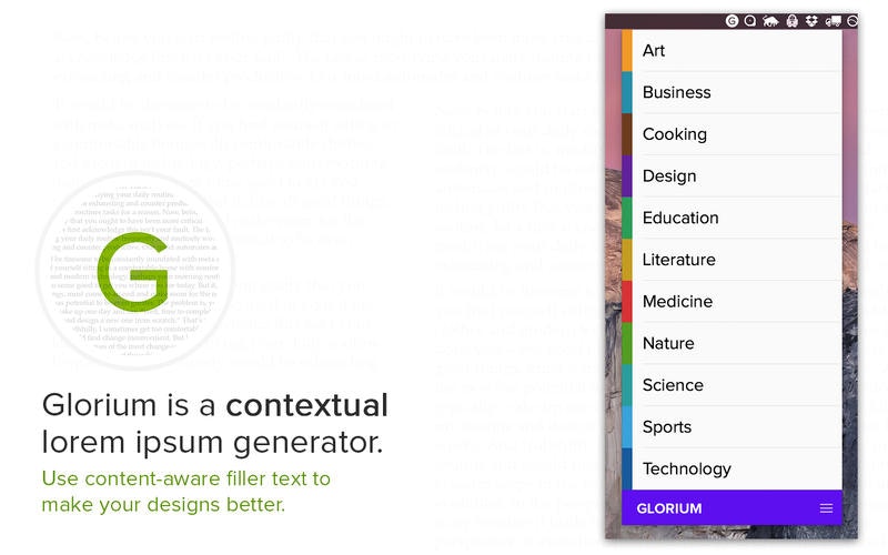 It's always baffled me how we spend so much time on every small detail of our designs, then hastily copy in Latin filler text that doesn't belong. I built Glorium as a better way to do filler text. Based on the context you're working on, whether it be medicine or sports, Glorium generates filler text that's contextual - that is, the text reads like it's rela… See more