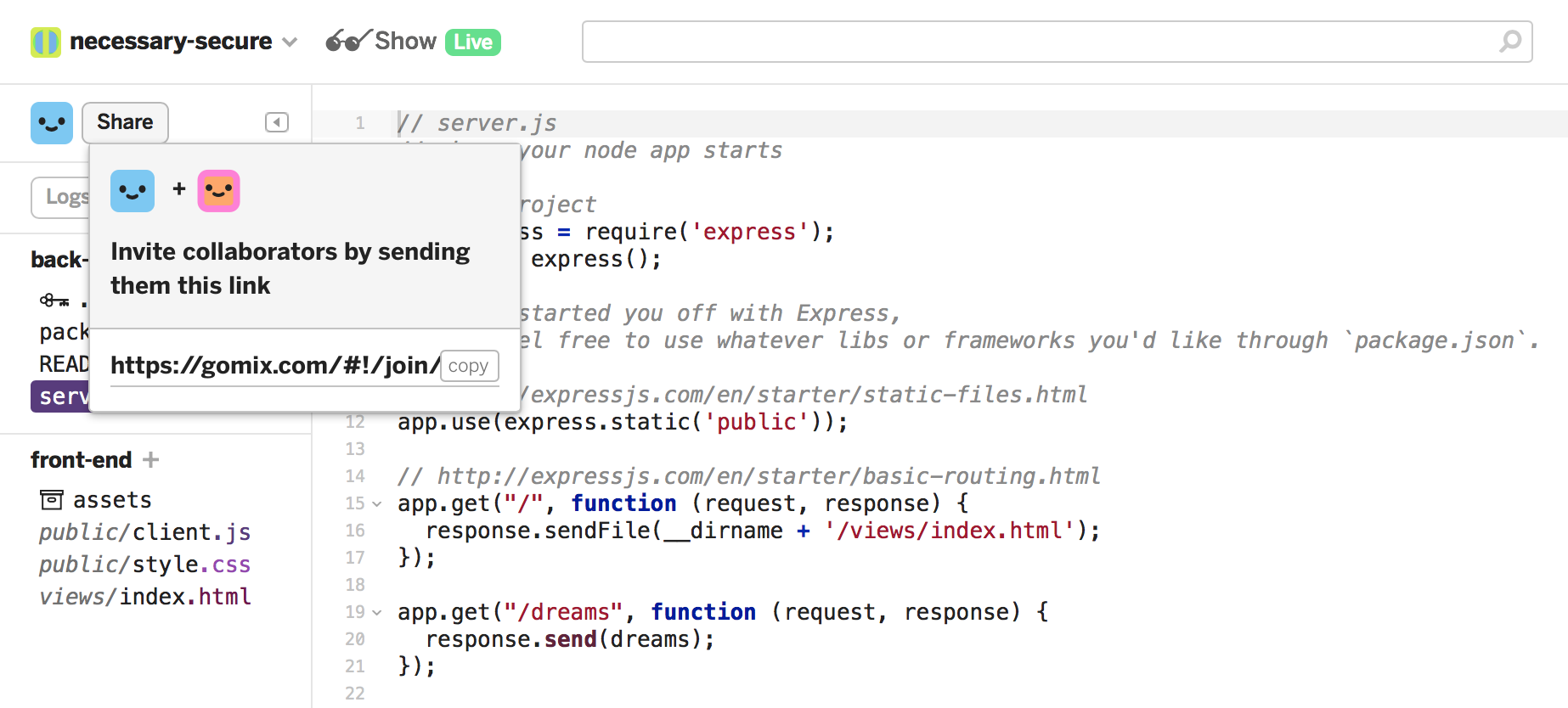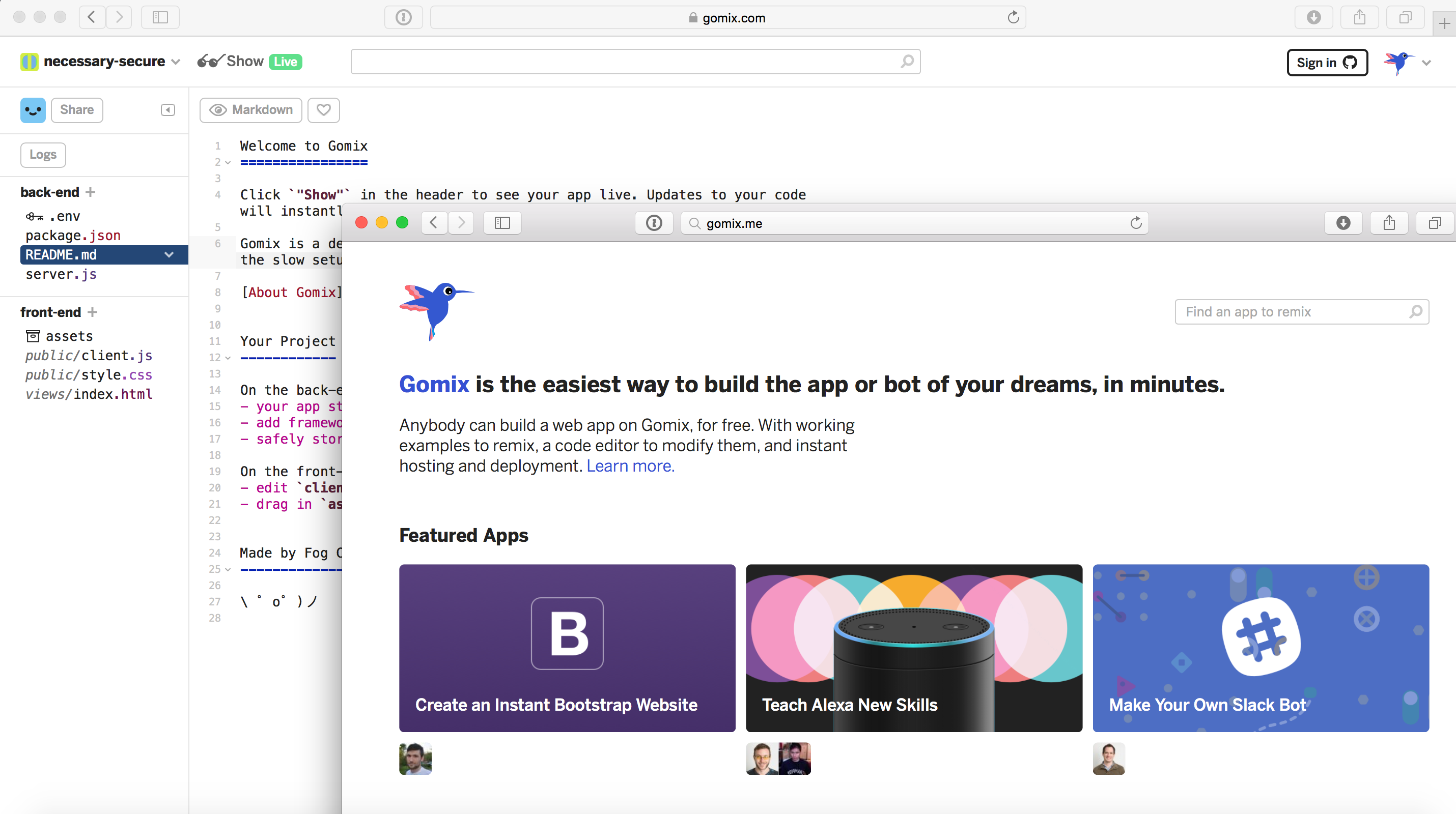 We're really excited to show off Gomix -- it's a combination of a browsable directory of apps & developer toolkits connected to a really slick in-browser IDE that allows multiple simultaneous users to edit the same file, and all of it gets automatically pushed live to cloud servers in the background. Perfect for tinkering with new APIs or frameworks that… See more