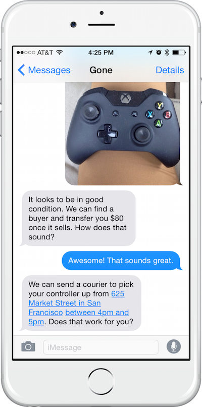 Hey all! I’m the Product Designer with Gone. We’re thrilled to announce GoneSMS as a corollary service to our iOS app (http://www.producthunt.com/tech/...). Through SMS, you’ll be welcome to have a conversation with my talented colleagues who will walk you through the entire process of selling the things you have lying around.