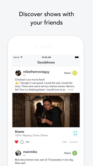 Goodshows is a social network for TV geeks and movie fanatics. You can discover your next favourite show and also discuss favourites by following your friends and other like-minded people, rate & review shows you’ve watched, keep track of new episode releases by adding them to your watchlist and also share your re… See more