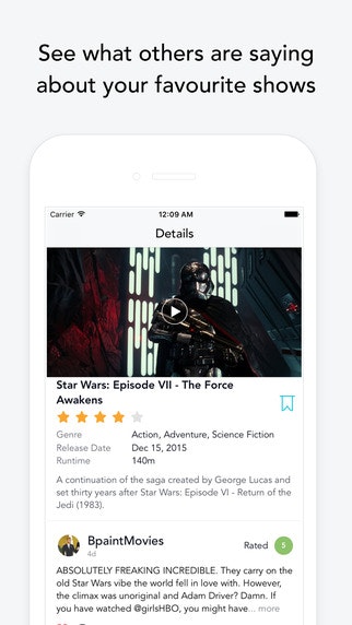 I've been beta testing this app for a month now. One cool thing about this app is, I get to read authentic reviews coming straight from my friends and people who I follow. I can imagine this could change the way we build our watchlist of tv shows and movies. Great work @kidsid49.