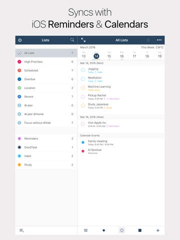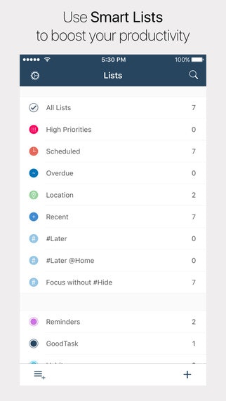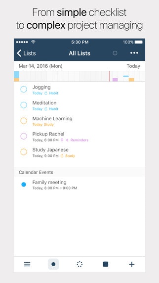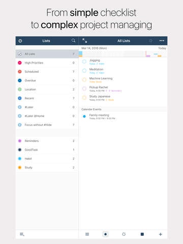 GoodTask is a task manager app based on iOS Reminders and Calendars that you can use as simple checklist or even as complex project management tool. It's highly customizable with many powerful features which makes it possible.