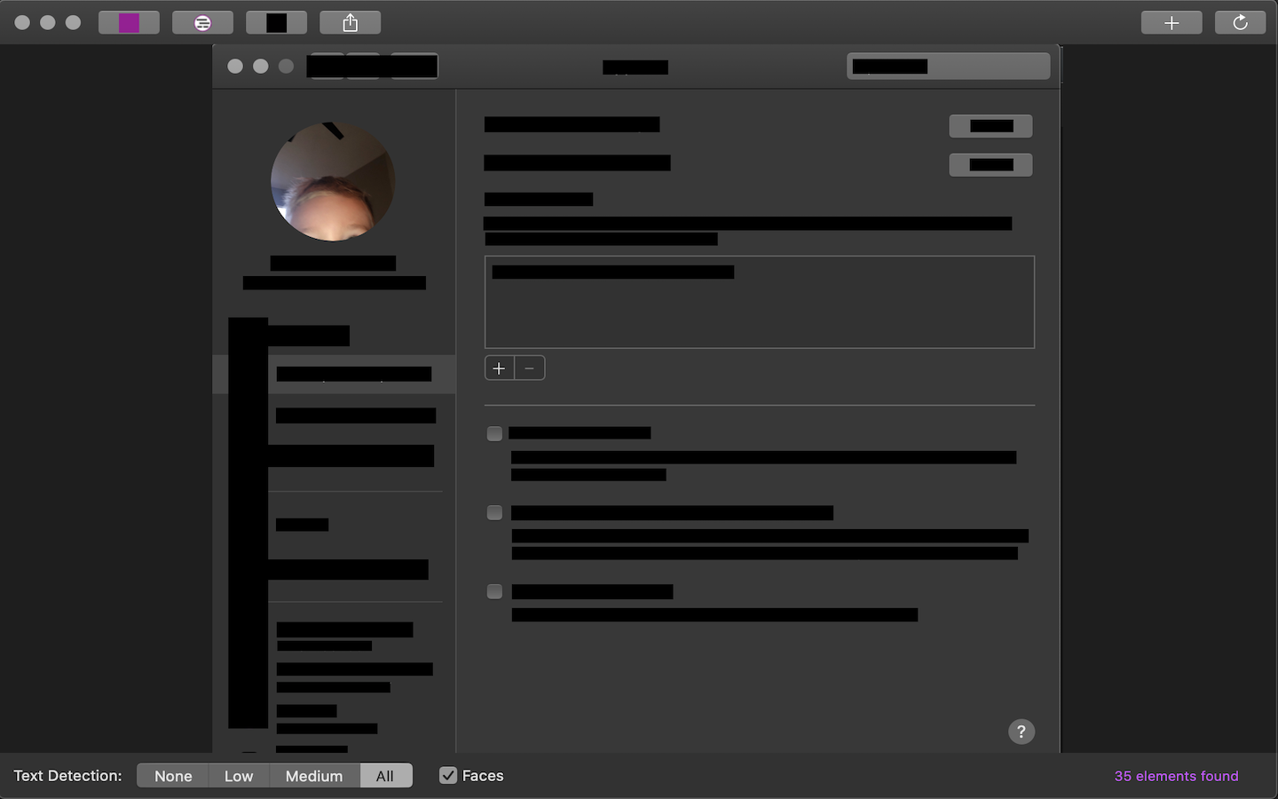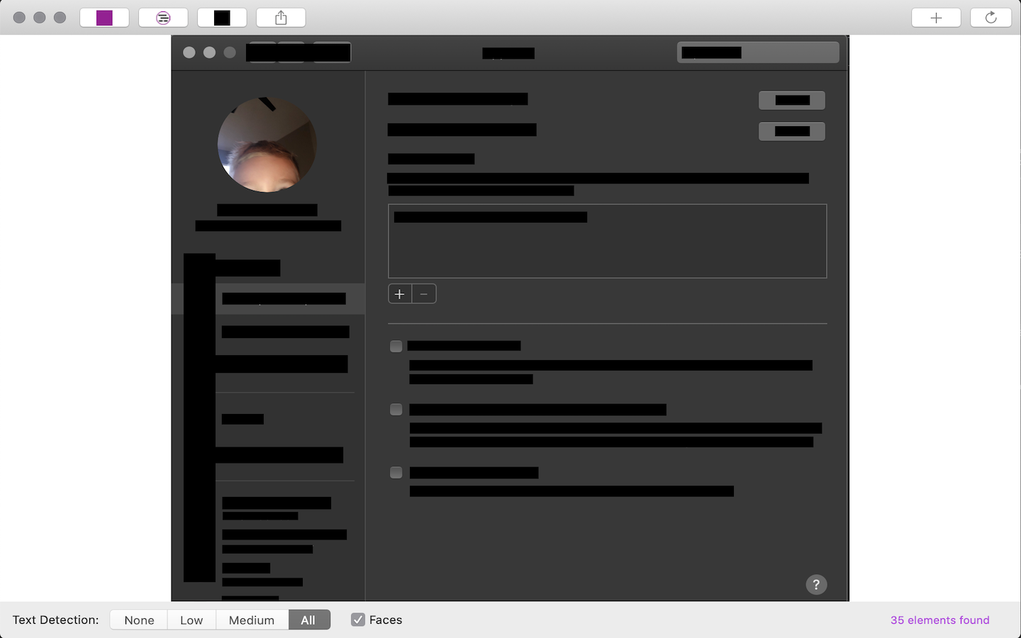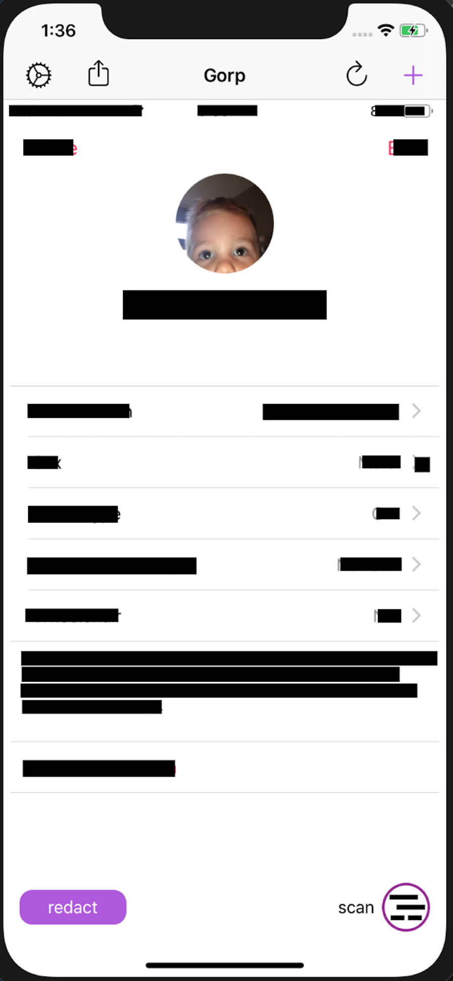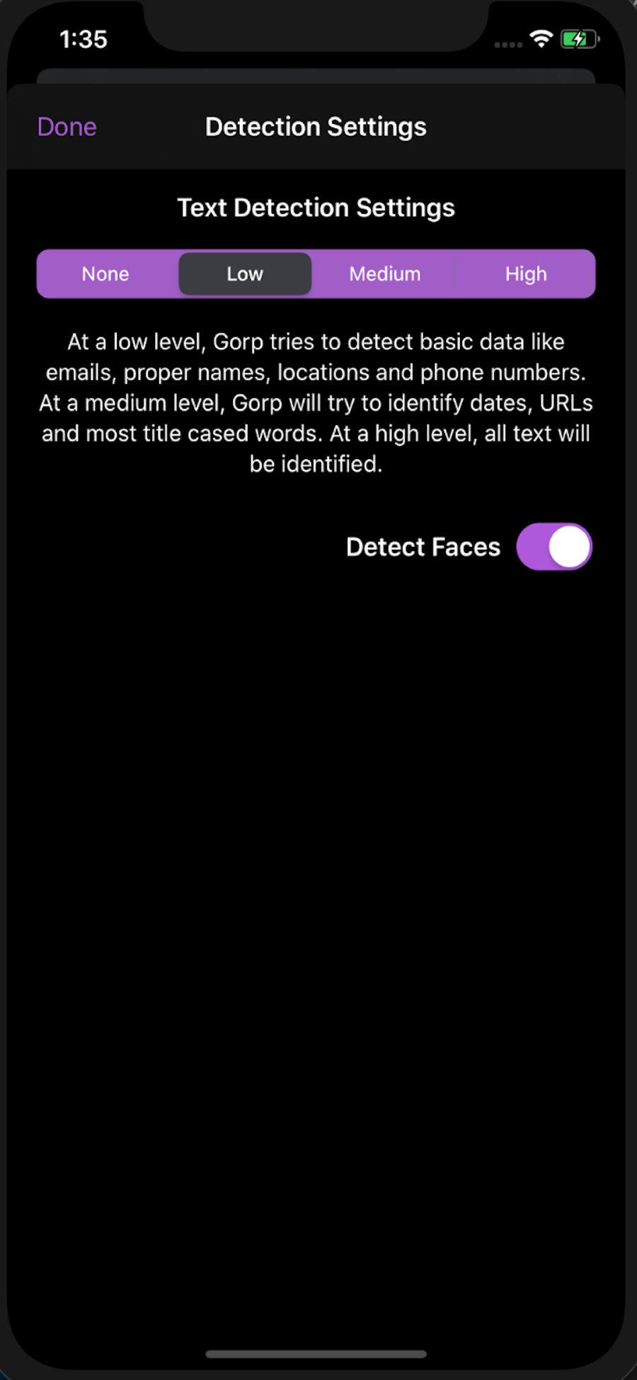 Gorp uses on-device machine learning to detect data which might be protected and redacts it, without ever sending anything over the network. It does not store or learn from any data it finds and does not contain any analytics libraries.