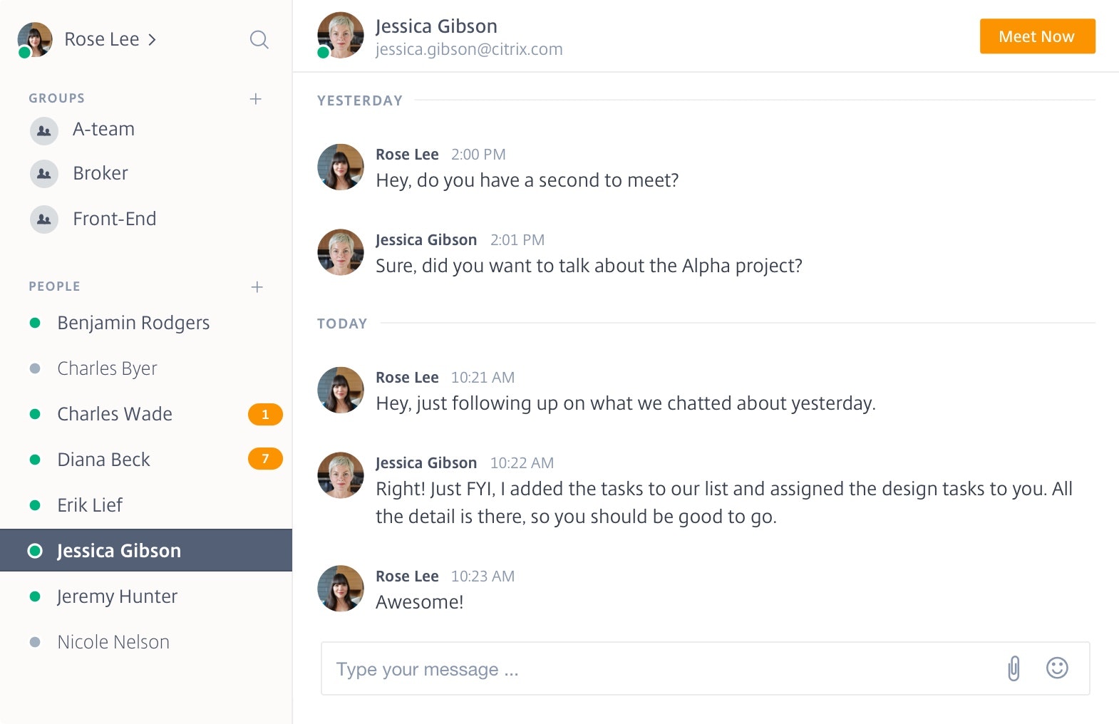 See who's online, start a chat, and start a meeting.