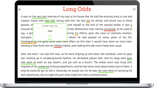 1. Our software is likely catered to more advanced writing than the students your wife teaches. Most of our users are in the final years of high school or college, and we have a large number of professionals using our product too. The software is therefore targeted at improving writing at that level (and those users generally have no problem with 4 syllable words).