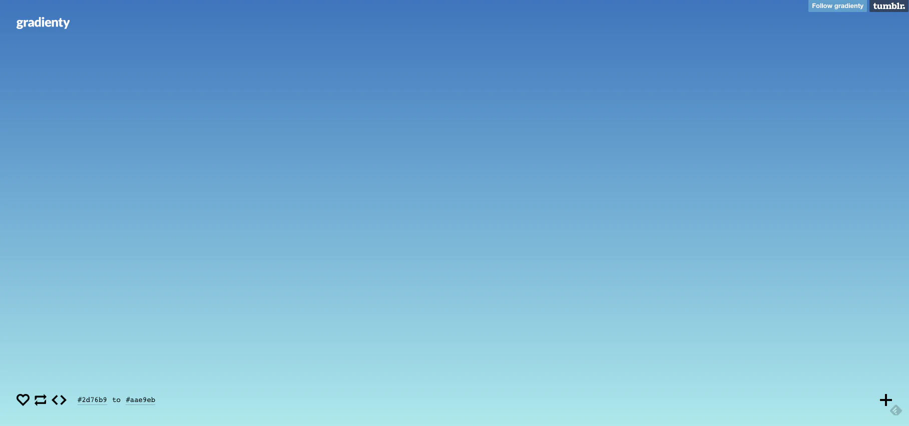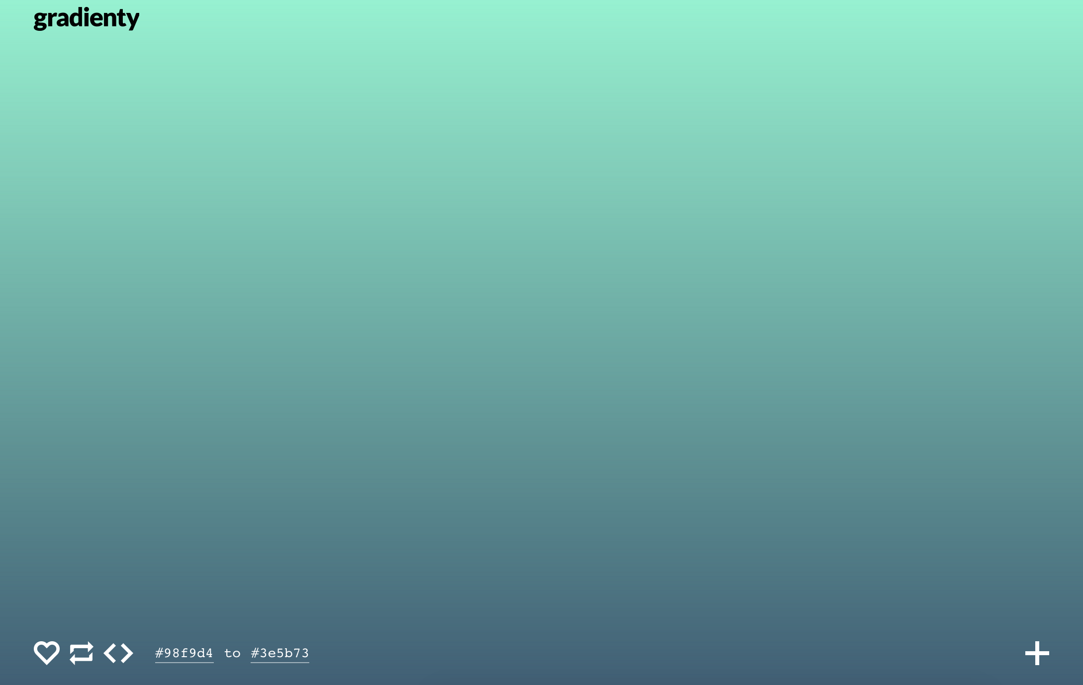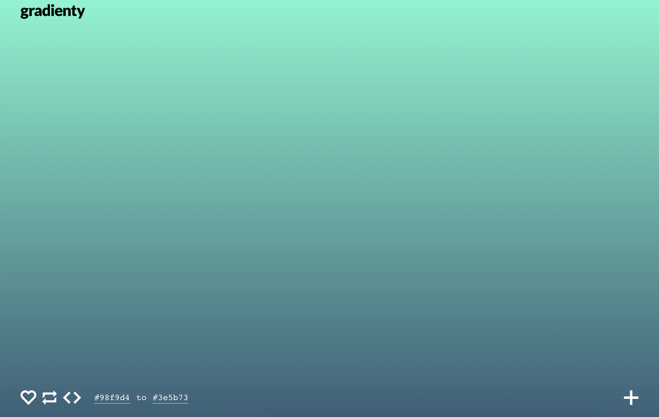 Gradienty is home to thousands of gradients created by you or a computer and posted every hour. Generate your own gradient or find the perfect gradient for your next project. Copy color hex codes or the CSS gradient code directly from the gradient.