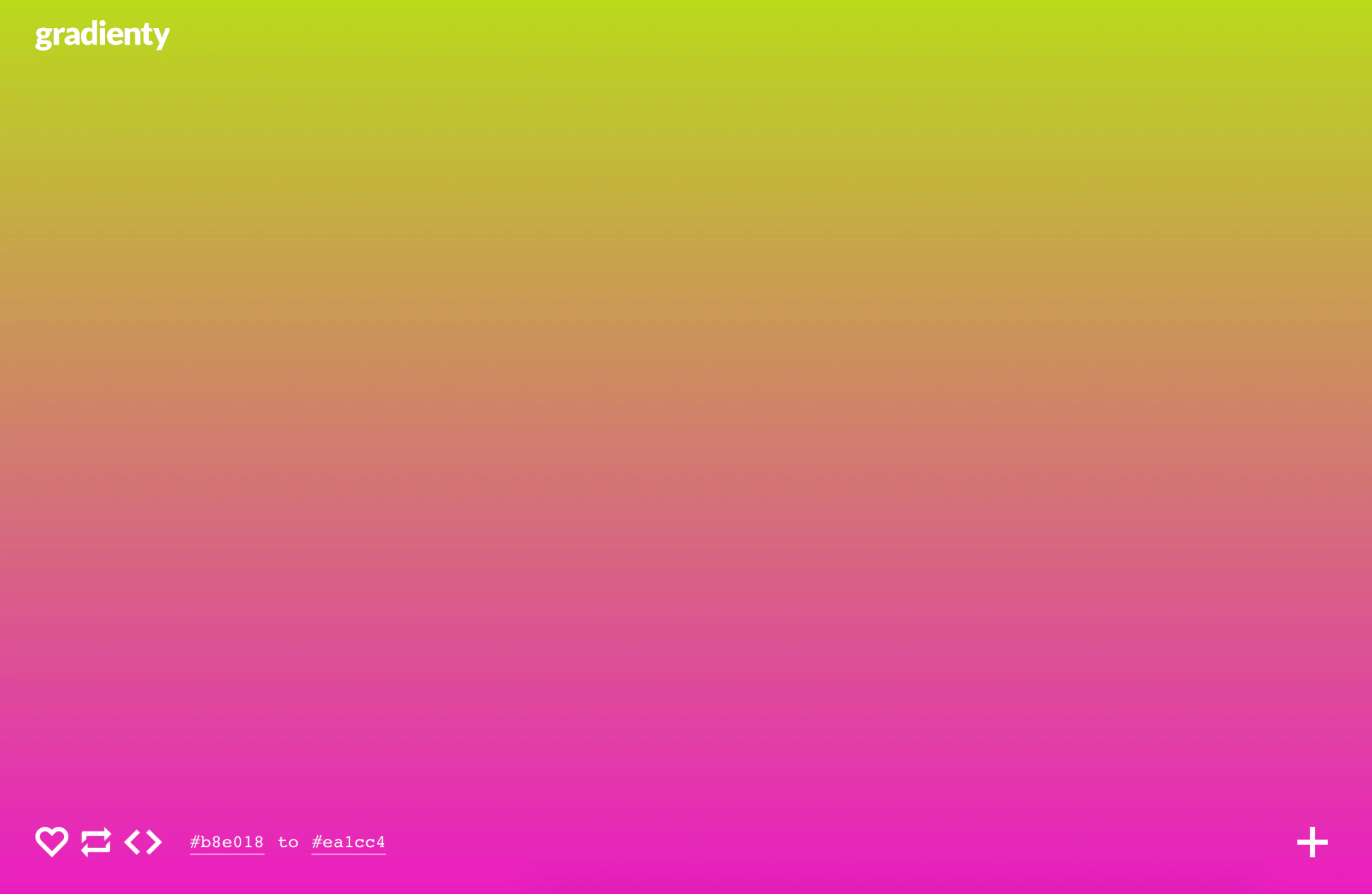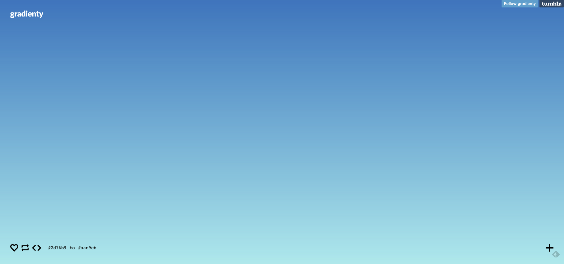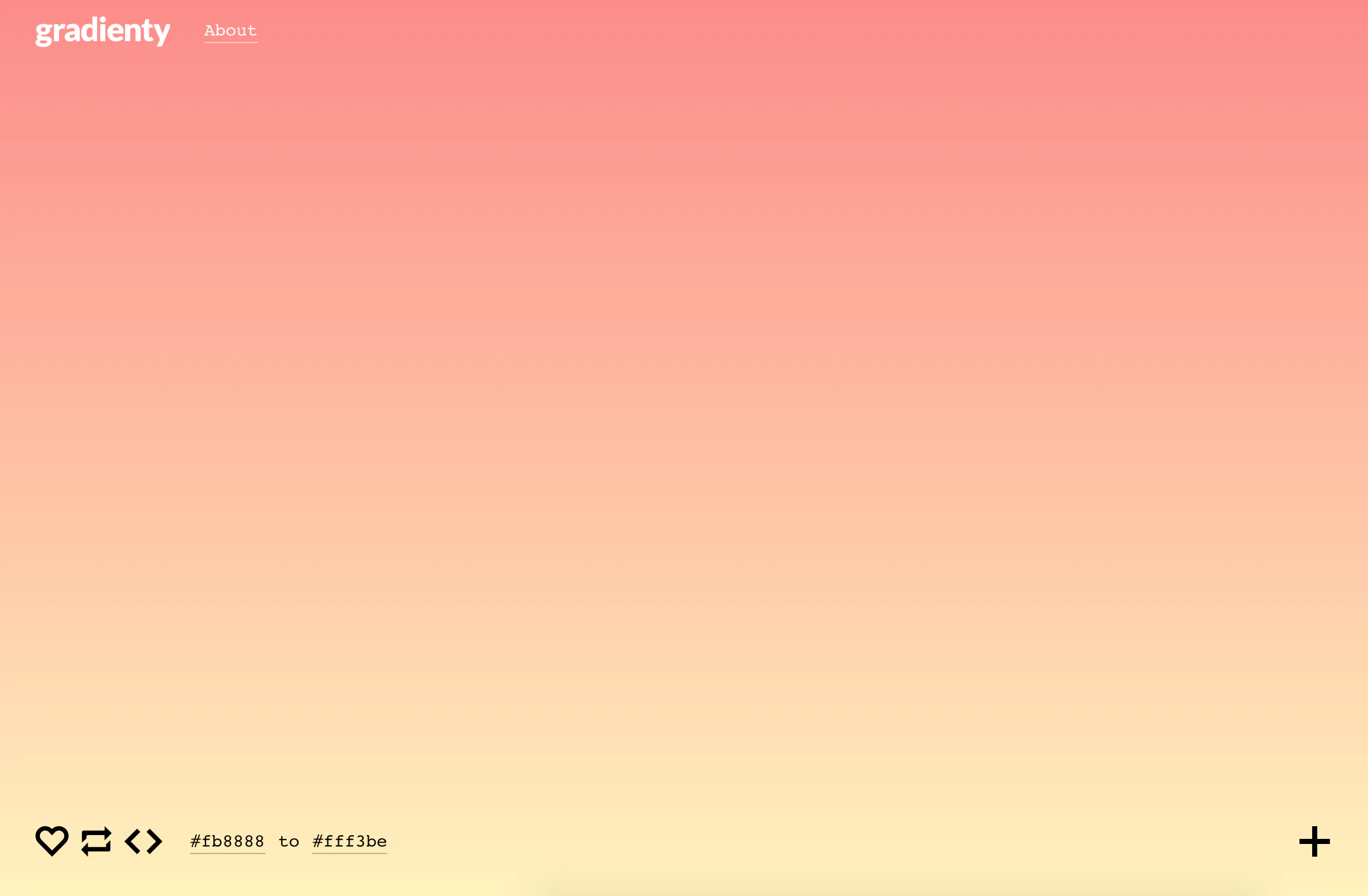 Gradienty is home to thousands of gradients created by you or a computer and posted every hour. Generate your own gradient or find the perfect gradient for your next project. Copy color hex codes or the CSS gradient code directly from the gradient.