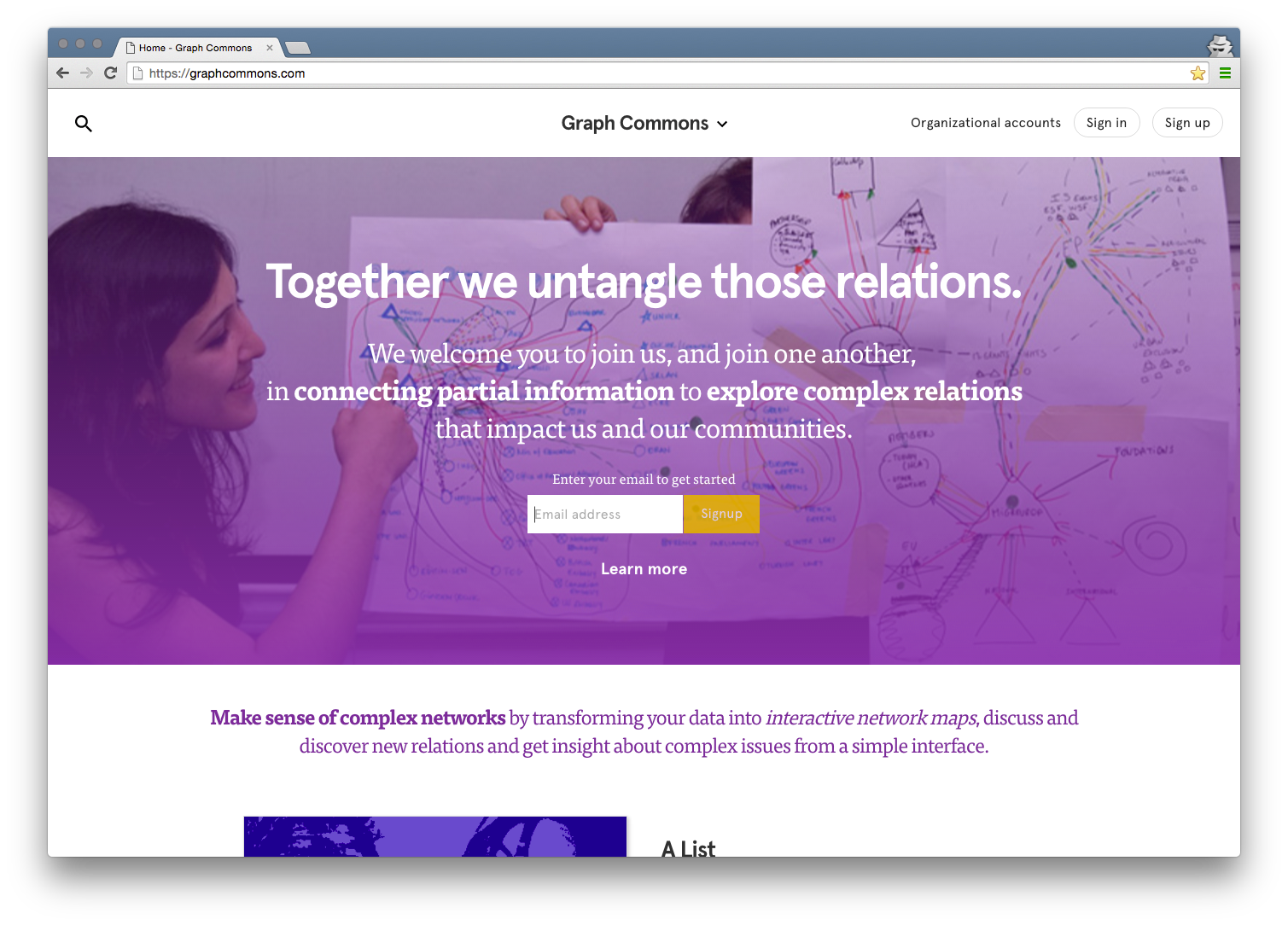 Graph Commons is a collaborative platform for mapping, analyzing, and sharing data-networks. By transforming your data into interactive network maps, it helps you discover opportunities, tell compelling stories, and make strategic decisions.