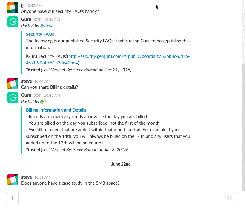 My company has been using Guru for the past few months. Rick's team at Guru is amazingly helpful during the onboarding process, and this tool is a must-have for any company trying to scale internal knowledge across a growing team. The Slack integration makes it even easier to get people to access and contribute to the tool!