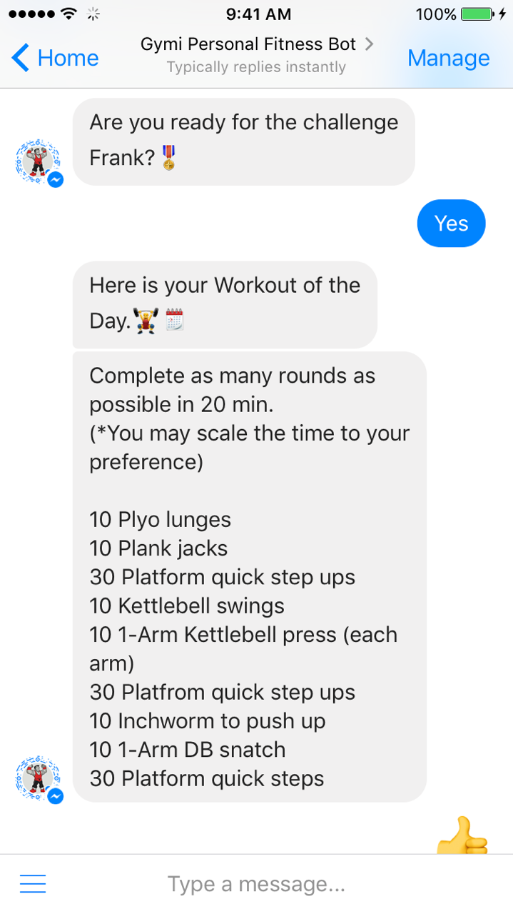 As a physical and health educator, strength and conditioning coach, working with colleges and athletes from the beginner level to professional level it has been a goal of mine to create a bot that can be accessible from anywhere in the world.