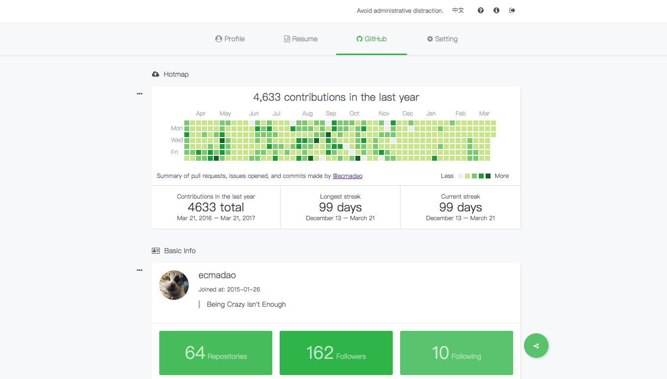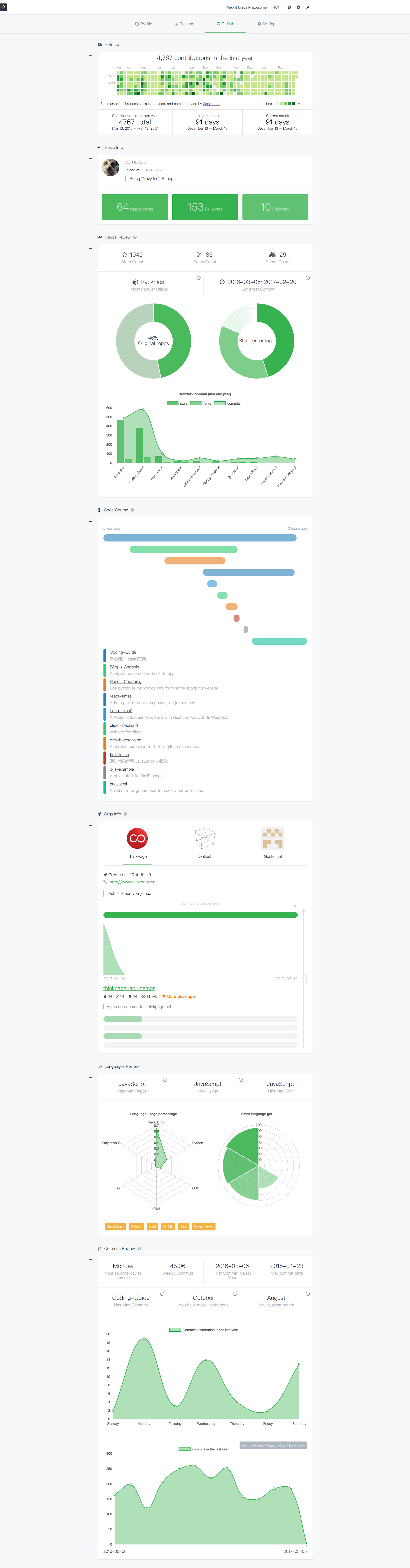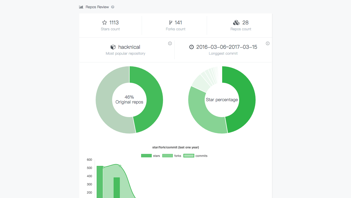 Hey guys, I am the author of hacknical, which born for a better GitHub usage data summary, by using GitHub OAuth link to fetch your public datas and show them in the data visualization way. Until now, it support to show your GitHub repos & commits and languages in both ZH and EN ways. Besides, I'm happy to receive your issues and suggestions. THX!
