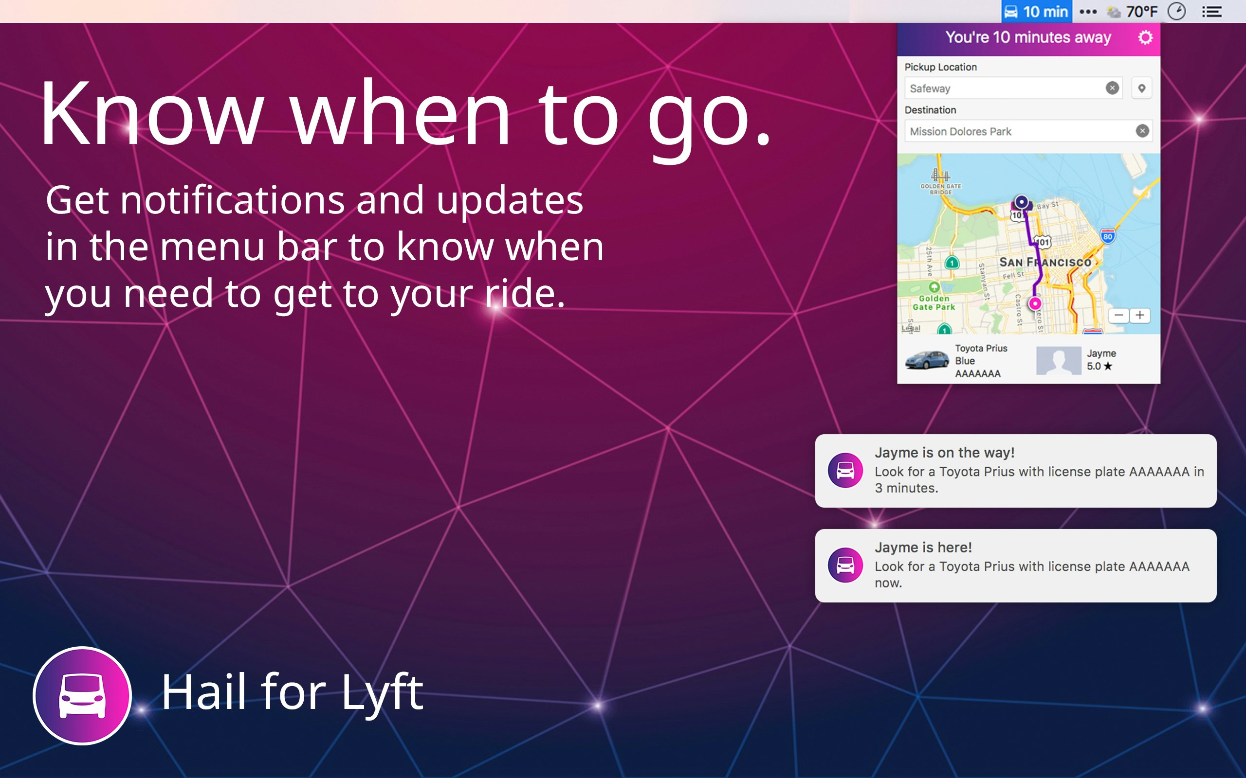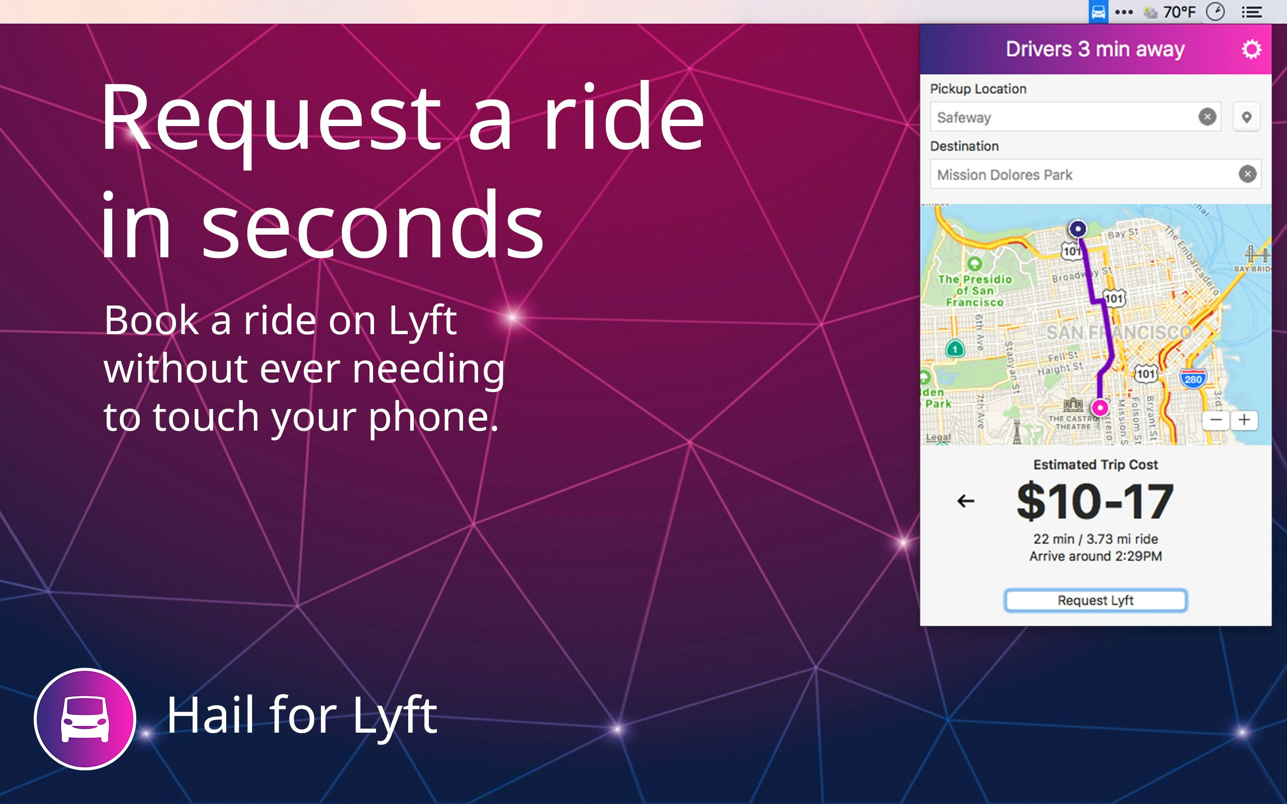 With Hail, you can now get a ride from your Mac, without needing your phone at all! Hail stays in your menu bar, and can quickly be brought up with a keyboard shortcut, keeping ride estimates just a tap away.