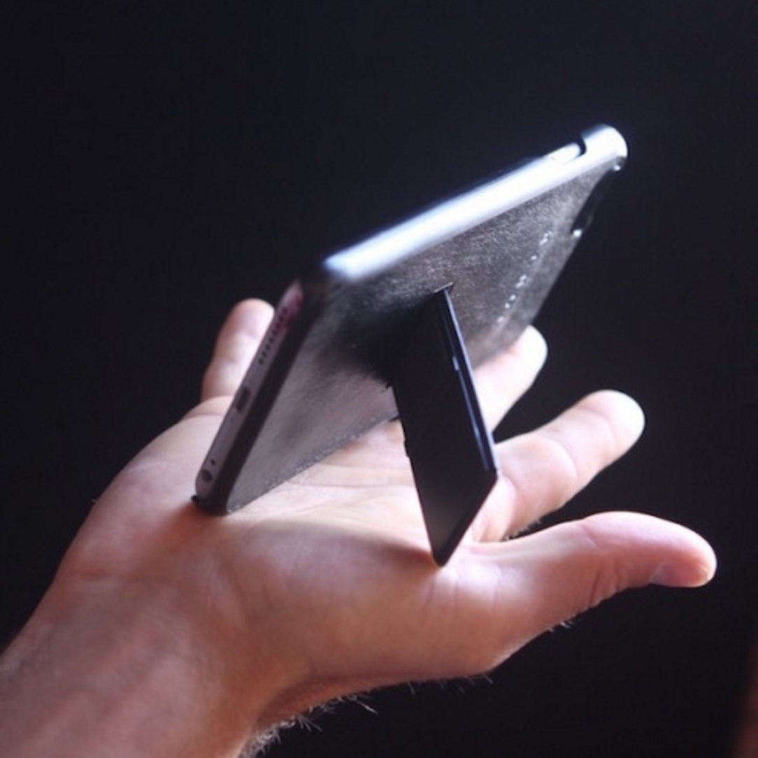 The case gives the effect that the phone is simply floating in your hand. Slide the brace down to the base of the cord and voilà, the case doubles as a stand.