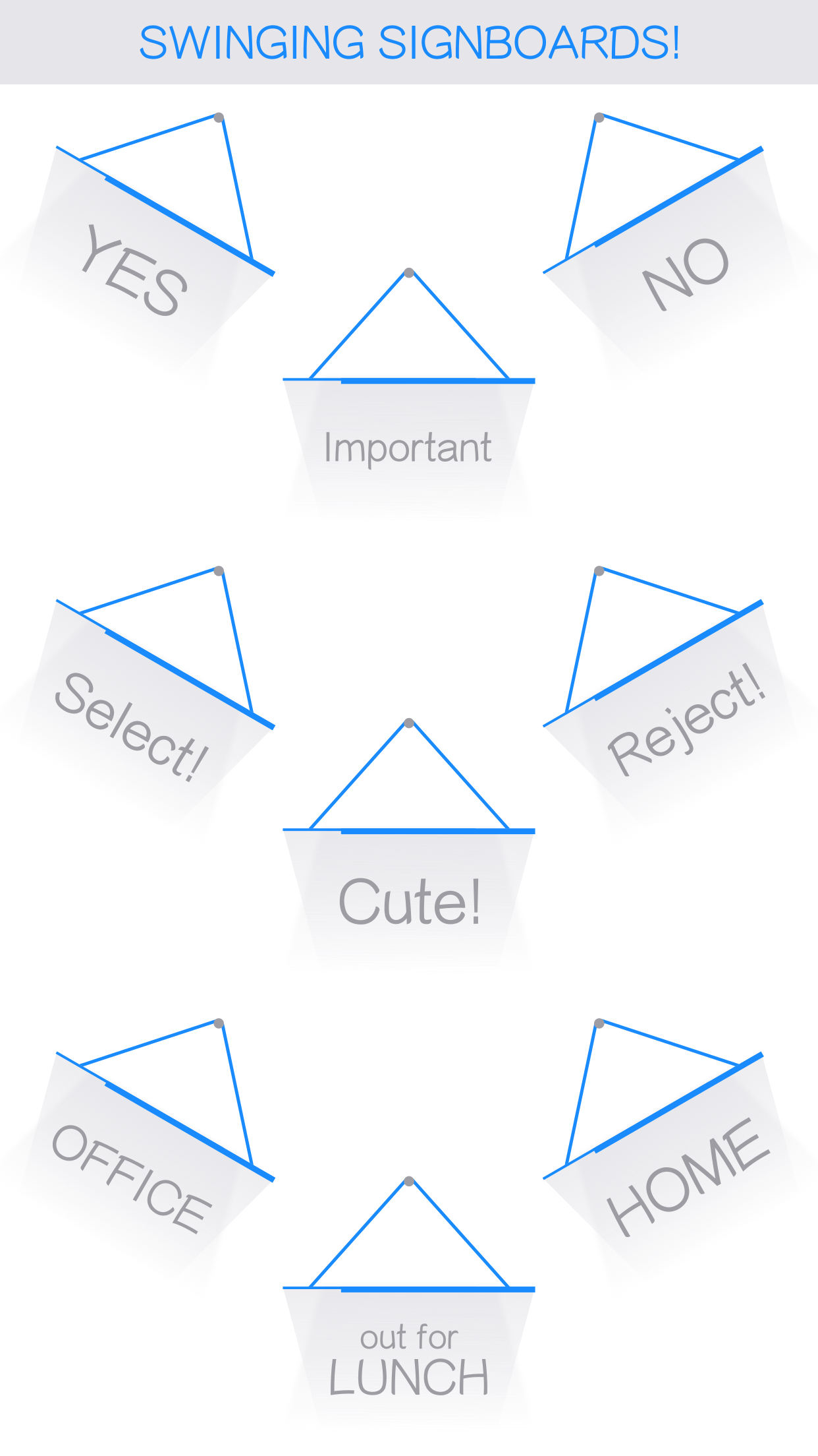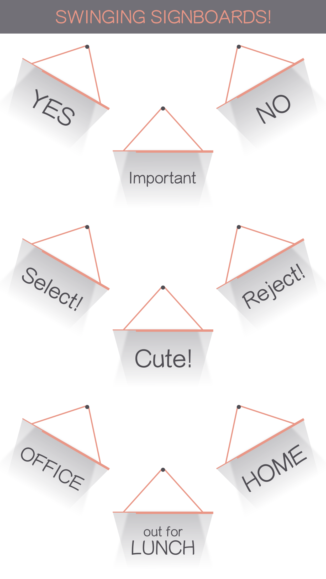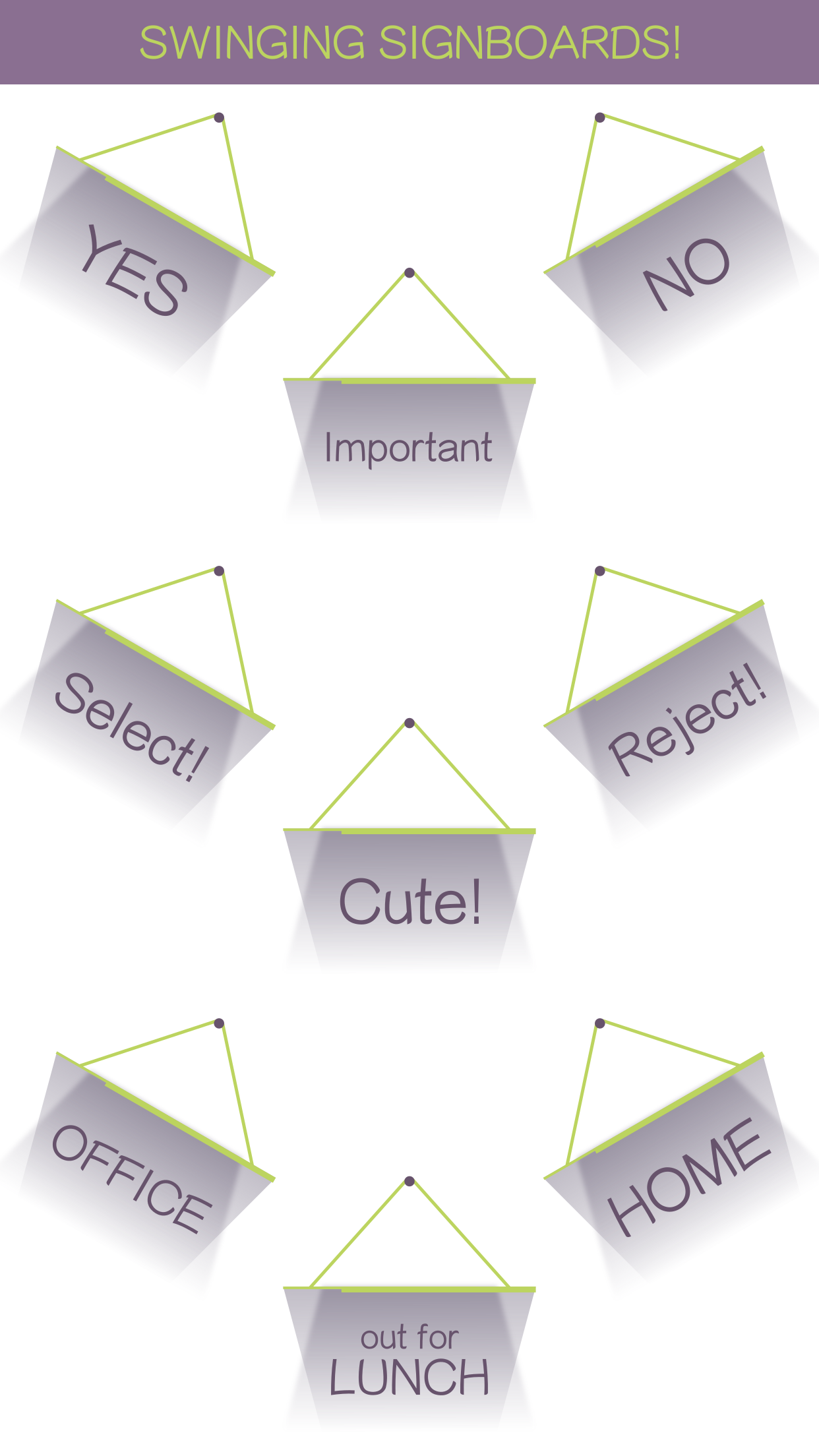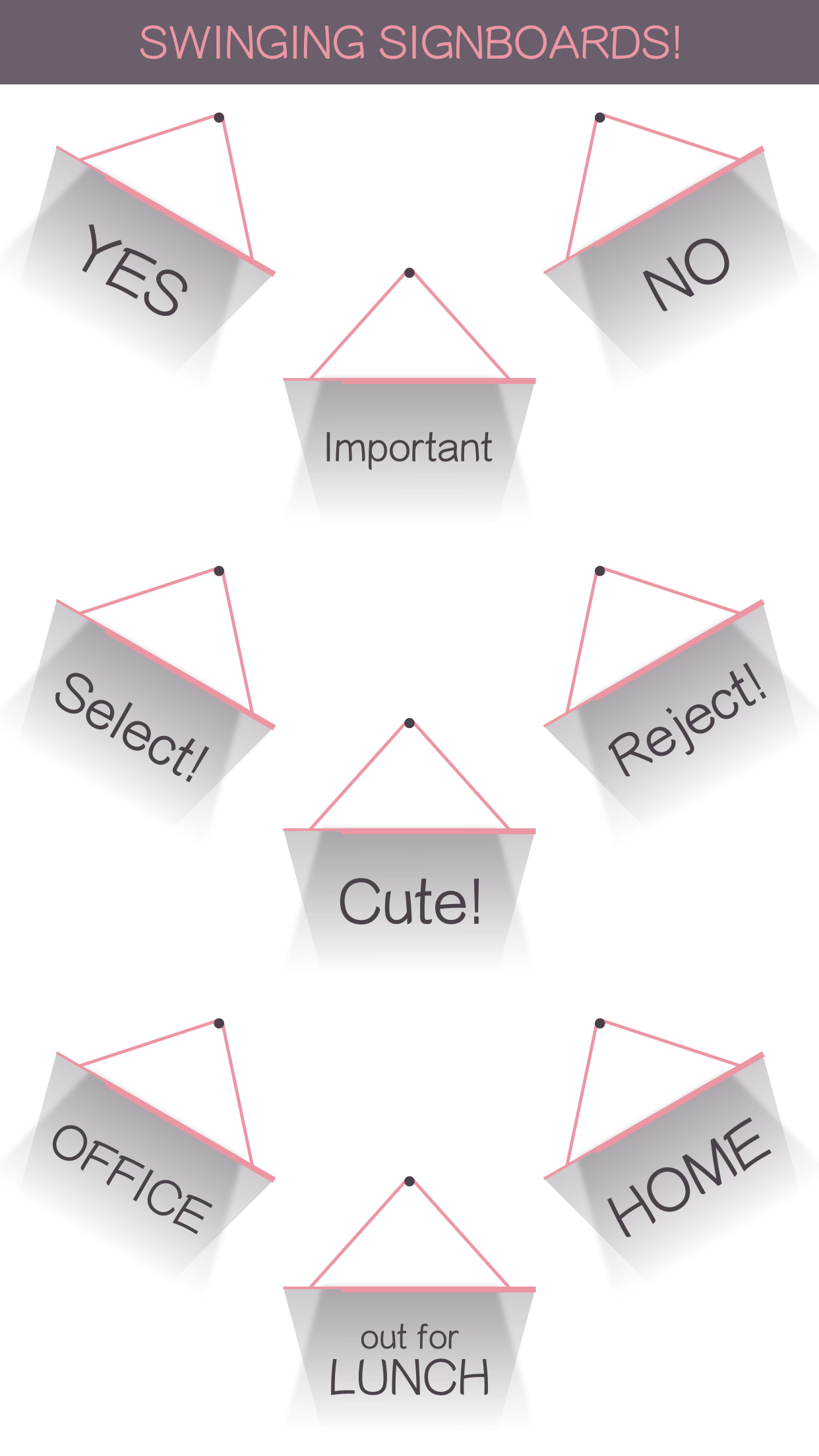 Hello people! I took some time out to make some simple and sober iMessage stickers in the form of signboards! Signboards have a simple swinging animation and quite a few commonly used messages to choose from. They are available in plenty of colors as well! Useful for tagging some important messages in a conversation.