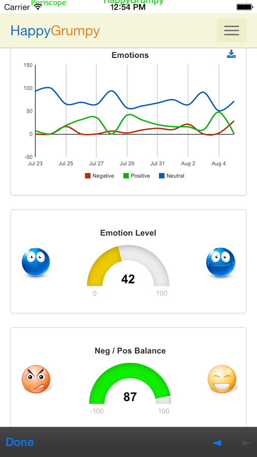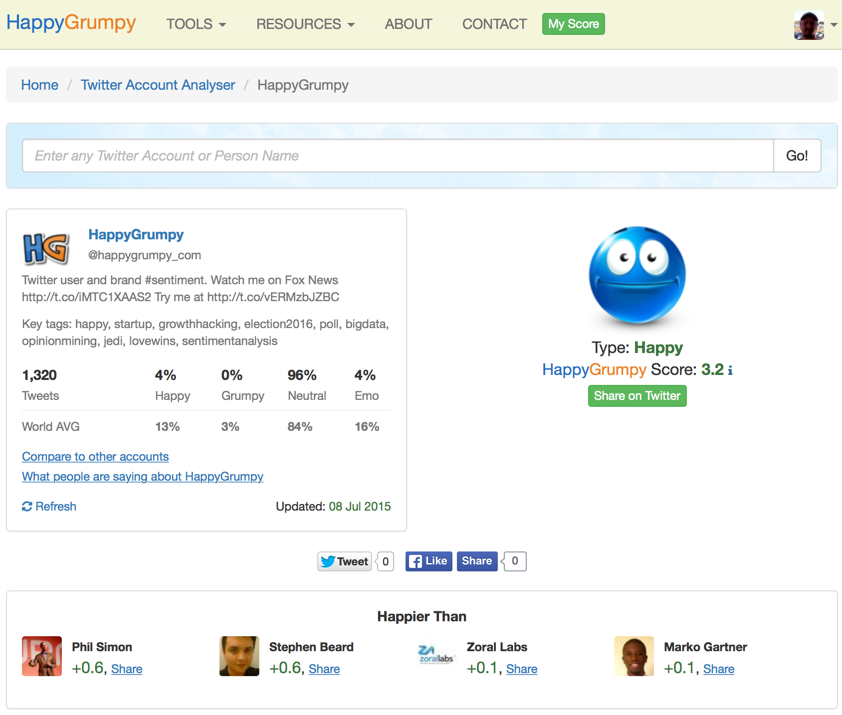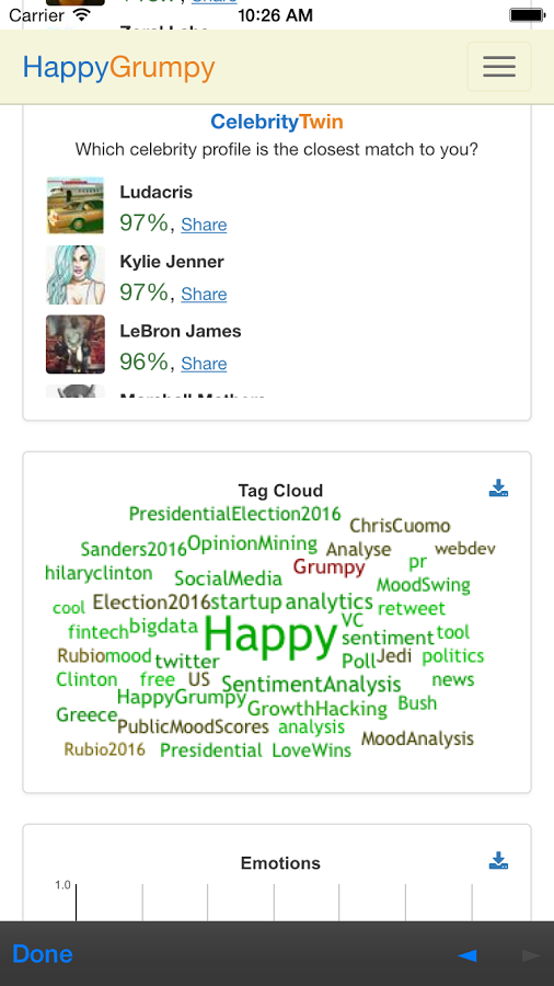 1) Twitter account analysis -- just fun feature, analyses your (or any other account) tweets for sentiments / emotions -- https://www.happygrumpy.com/twit...