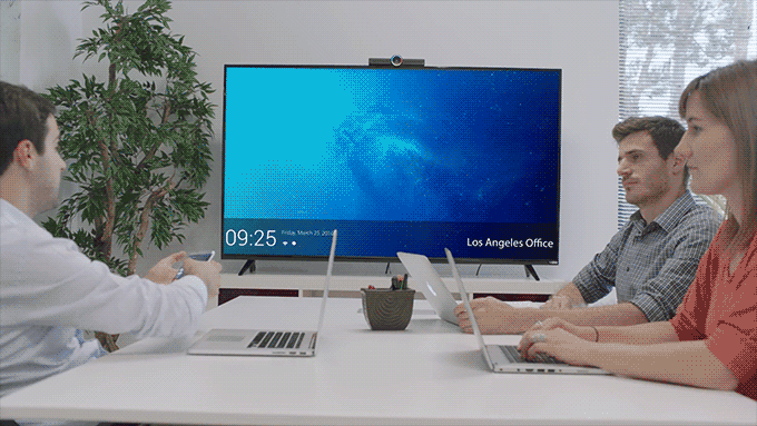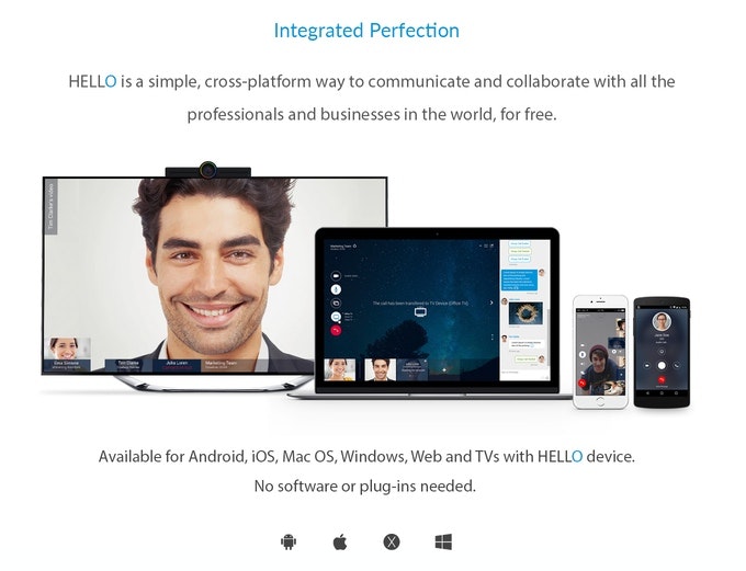 The Hello device is designed to be affordable for businesses and individuals. It requires only two cables – HDMI and power – and then turns any TV into a voice-controlled cross-platform communication device, with wireless screen sharing, live broadcasting, and motion-activated security surveillance features.