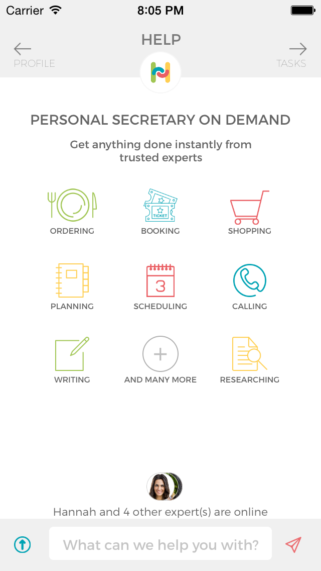 We want to simplify your life by providing a personal secretary on demand to help you with anything - ordering, shopping, planning, scheduling, researching etc. – instantly over chat. Just get anything done from trusted experts 24/7 at a flat service fee per minute! You can even place orders through the app with a tap.