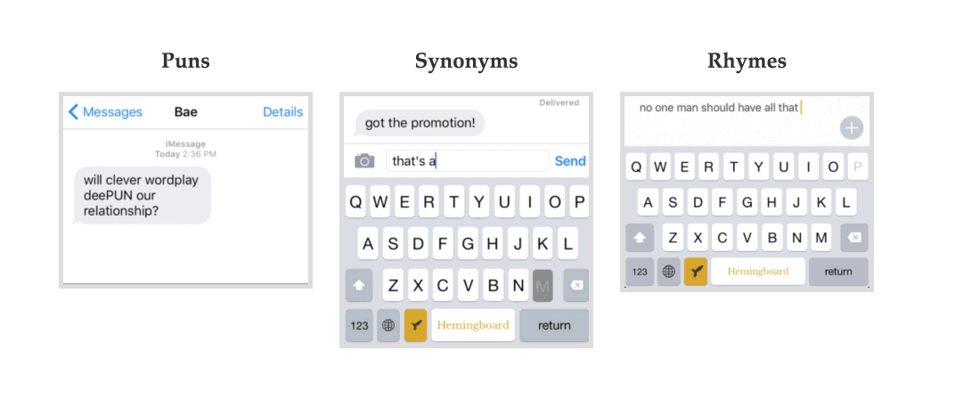Hemingboard is the keyboard with puns, synonyms, and rhymes built in. Type a word and tap the hummingbird to automagically get dozens of word and phrase suggestions.