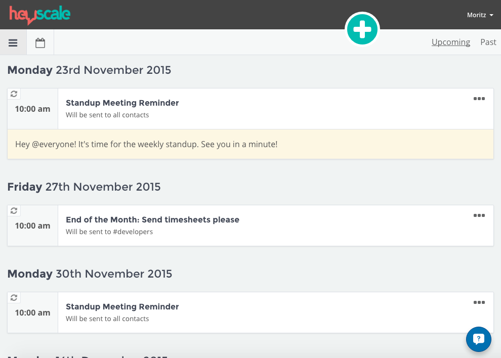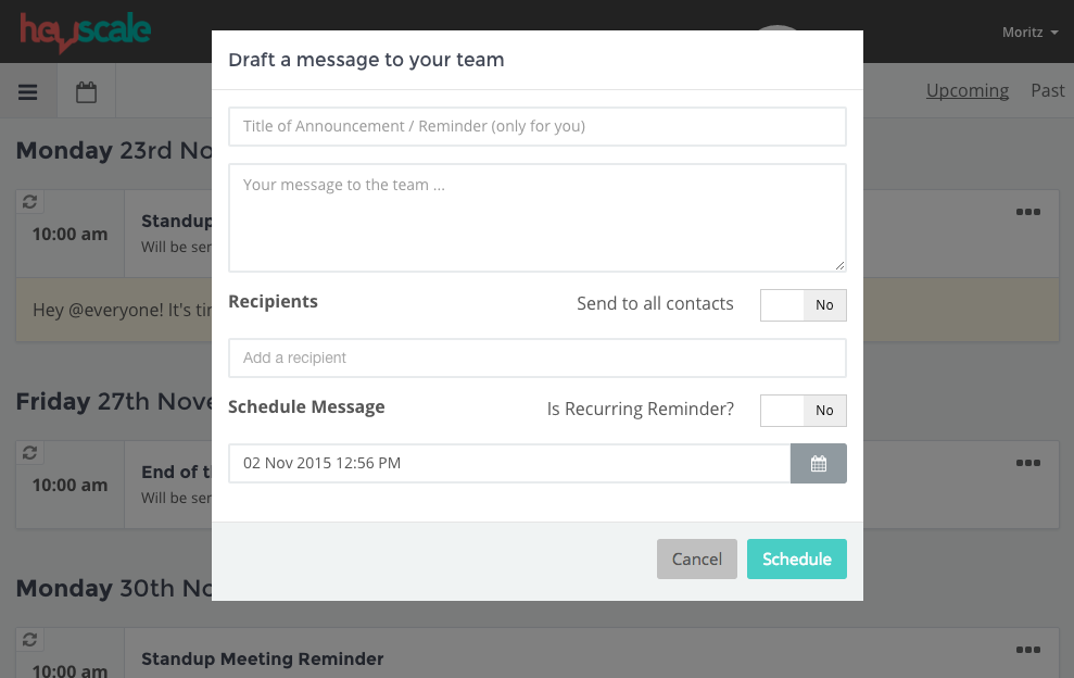 HeyScale is an attempt to streamline operations by sending out scheduled messages and recurring reminders to your team in Slack. Some of the use-cases we had in mind are calling out for the weekly stand-up, a reminder at the end of the month to clean up the desks, a reminder to send over time-sheets etc.
