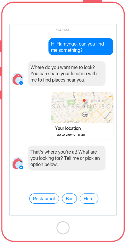 Hi Flamyngo is a pretty smart city guide bot which helps you find nearby restaurants, bars and hotels using Facebook Messenger + Foursquare data.